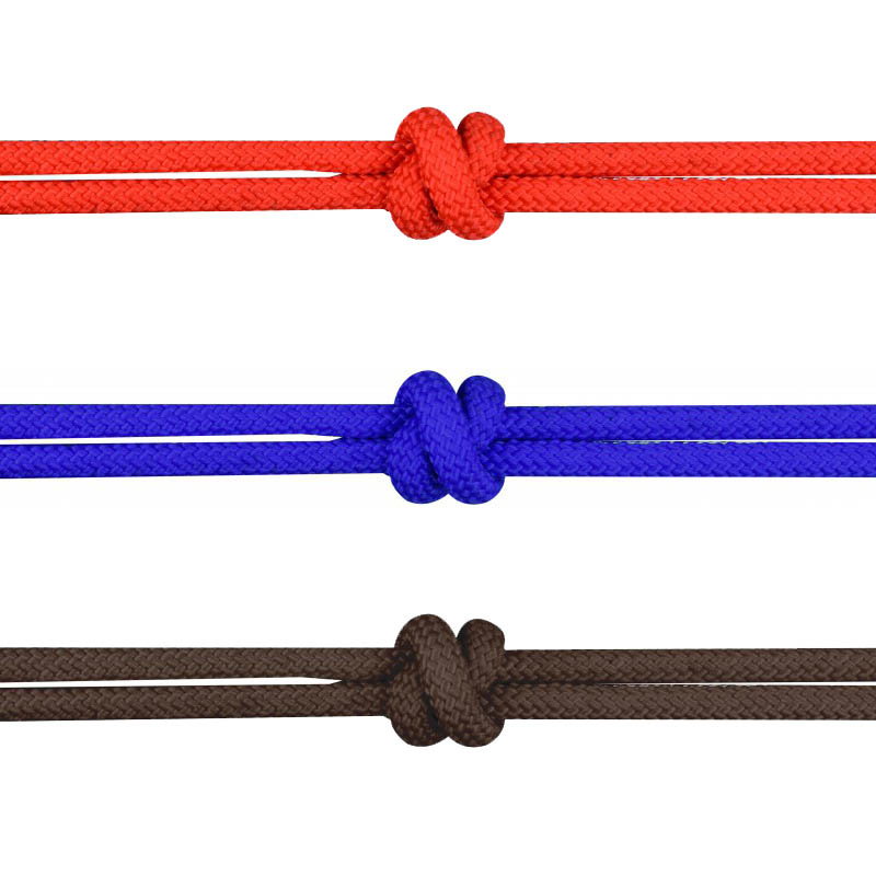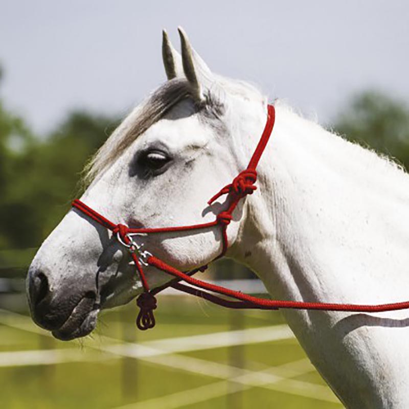 Rope halter complete with reins and carabiners. Knot horseman halter for etologic riding, in knotted polypropylene rope. There are two stainless steel rings on the center knots to hook the reins. Rope of 3 mt with swivel rifle hook. Unique full size.