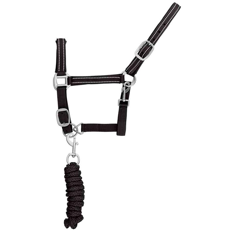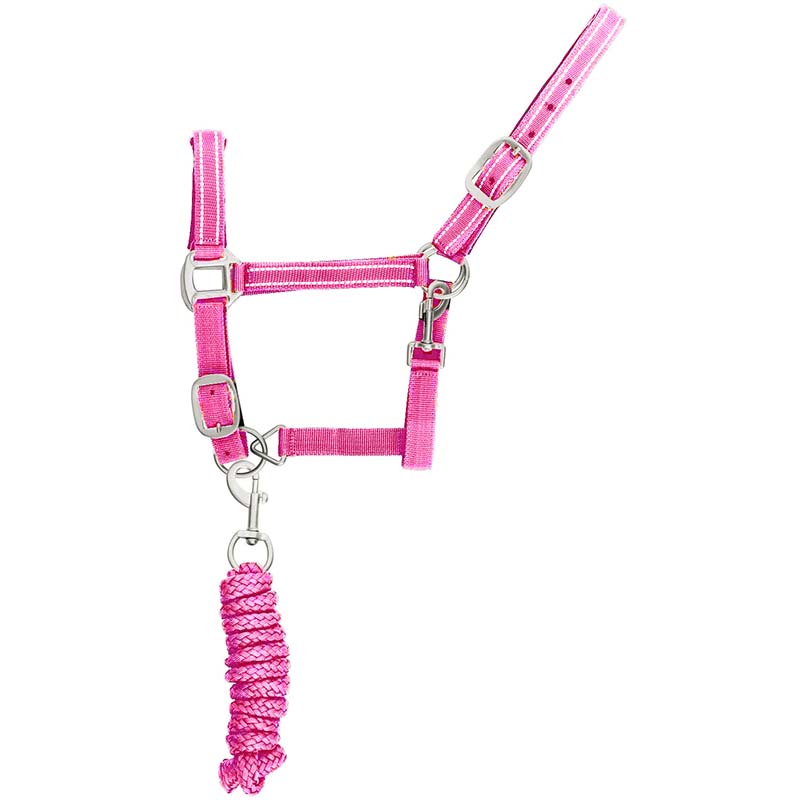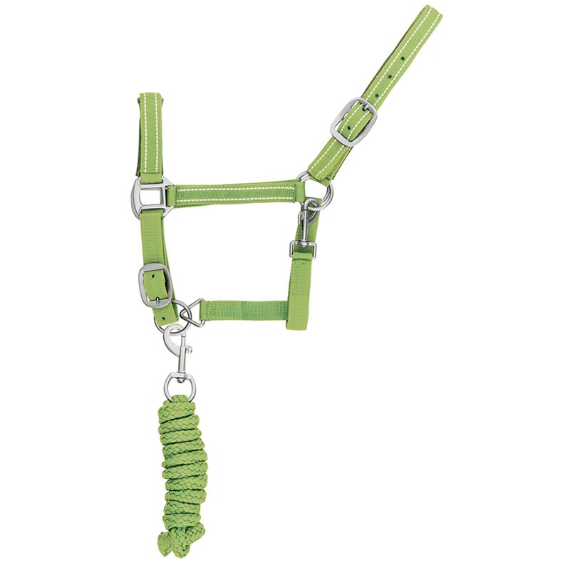 Reinforced nylon halter, with reflective stitching and lead. Halter complete with longe, solid color, with reflective stitching, satin buckles.