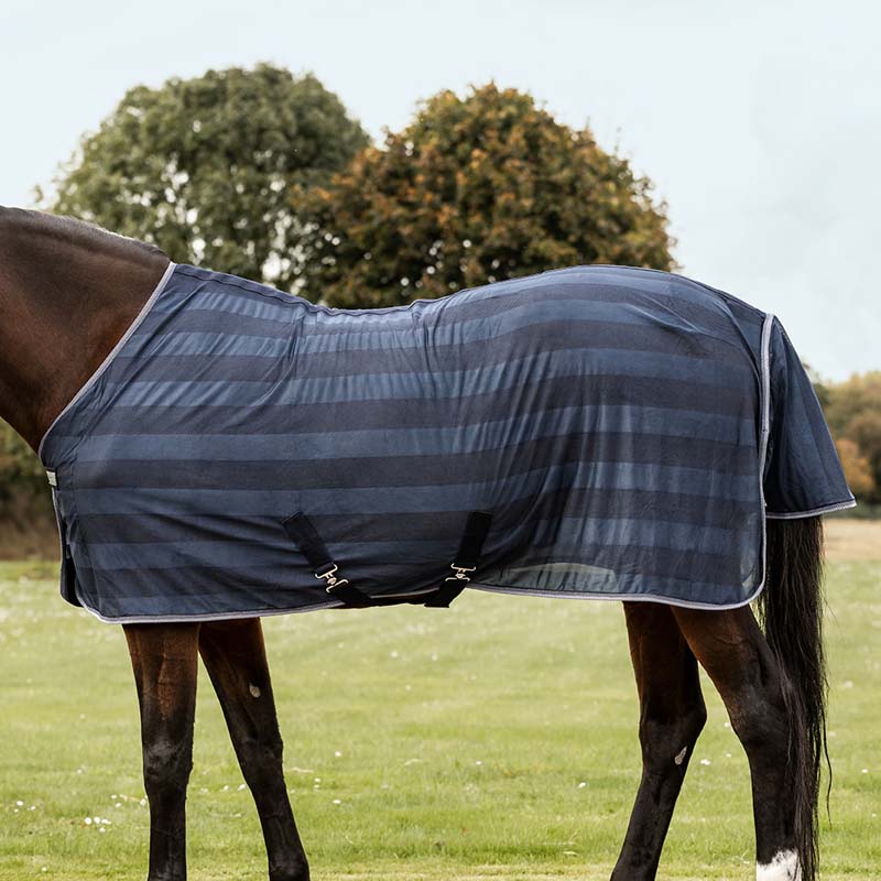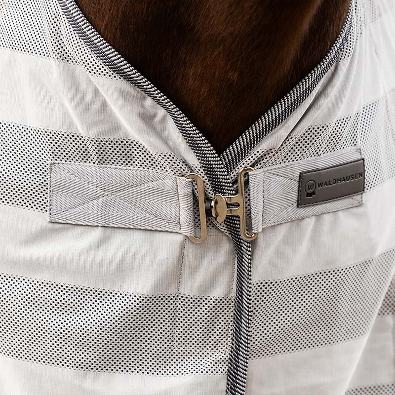Lightweight and breathable fine mesh fly sheet from the Waldhausen Economic line, providing protection against flies and annoying insects during the warm season. The Waldhausen Economic fly sheet is the perfect solution to shield your horse from flies, mosquitoes, and horseflies in spring and summer. Made from an ultra-lightweight fabric, it allows sweat to evaporate while keeping biting and flying insects at bay. Equipped with adjustable cross surcingles to ensure a perfect fit for every horse’s conformation, along with a secure front closure. The Economic fly sheet protects the horse’s body from insect bites and includes an additional tail cover. Thanks to the hind leg straps, the sheet stays securely in place, even when the horse moves in the paddock or outdoors.