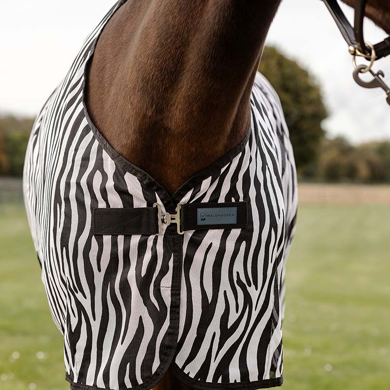 Waldhausen Zebra fly sheet with black and white striped pattern for optimal horse protection against insects. The Zebra fly sheet is designed to provide full protection against flies and other annoying insects during the warmer months. The black and white striped pattern creates a visual barrier that repels insects while adding a stylish touch. Made from lightweight, breathable fine mesh fabric, this fly sheet allows sweat to evaporate, helping to regulate the horse’s body temperature. The thin fabric acts as a physical barrier against flies, mosquitoes, and horseflies. Equipped with adjustable cross surcingles, a tail cord, a tail flap, and a single T-front closure.