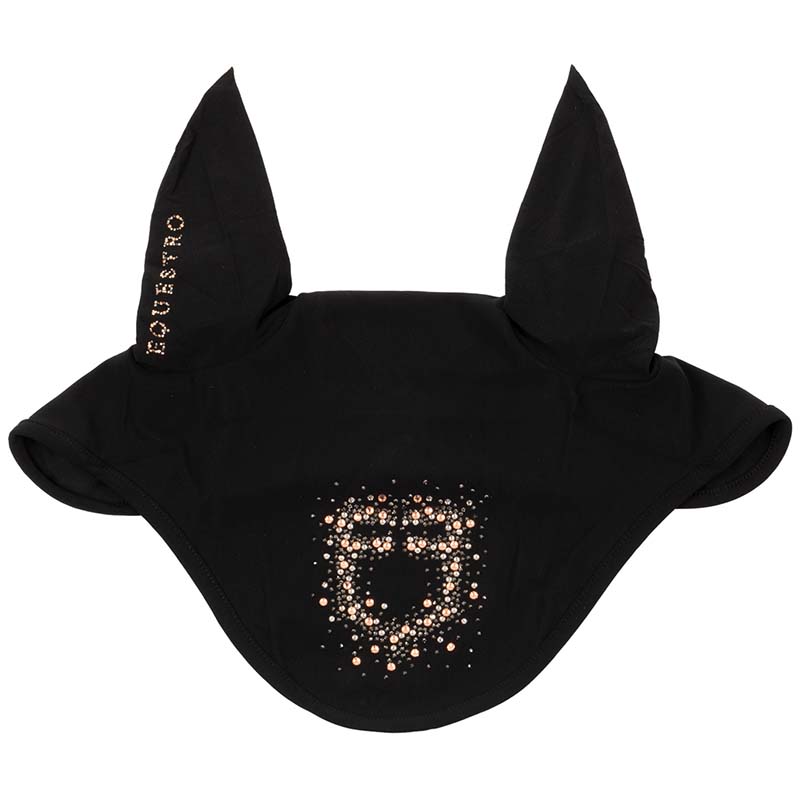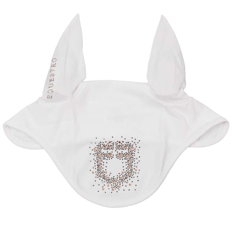 Equestro fly veil in breathable cotton with a glitter logo, providing comfort and elegance for your horse. The Equestro fly veil is crafted from high-quality cotton, offering an extremely soft and comfortable feel on the horse’s skin, allowing it to stay cool and dry thanks to the natural breathability of the fabric. This veil is designed to fit perfectly to the horse’s ear shape. With elasticated ear covers, it protects the ear area from insects, flies, and disturbing noises. The Equestro crystal logo on the front adds a touch of elegance and glamour, making it perfect for high-level competitions.