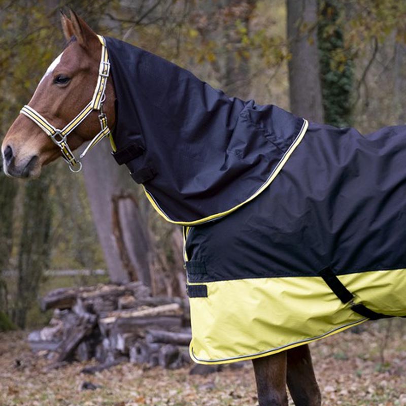 Reflective waterproof paddock neck cover without padding. Equi-Theme Tyrex 600 D turnout horse cover for neck without padding, with reflective piping, suitable for autumn or spring, to protect the horse outdoors from rain, wind and humidity. Waterproof but breathable 600 denier Ripstop polyester fabric. The reflex model has a reflective border, so when it is illuminated, it reflects in the dark allowing a quick identification of the horse.