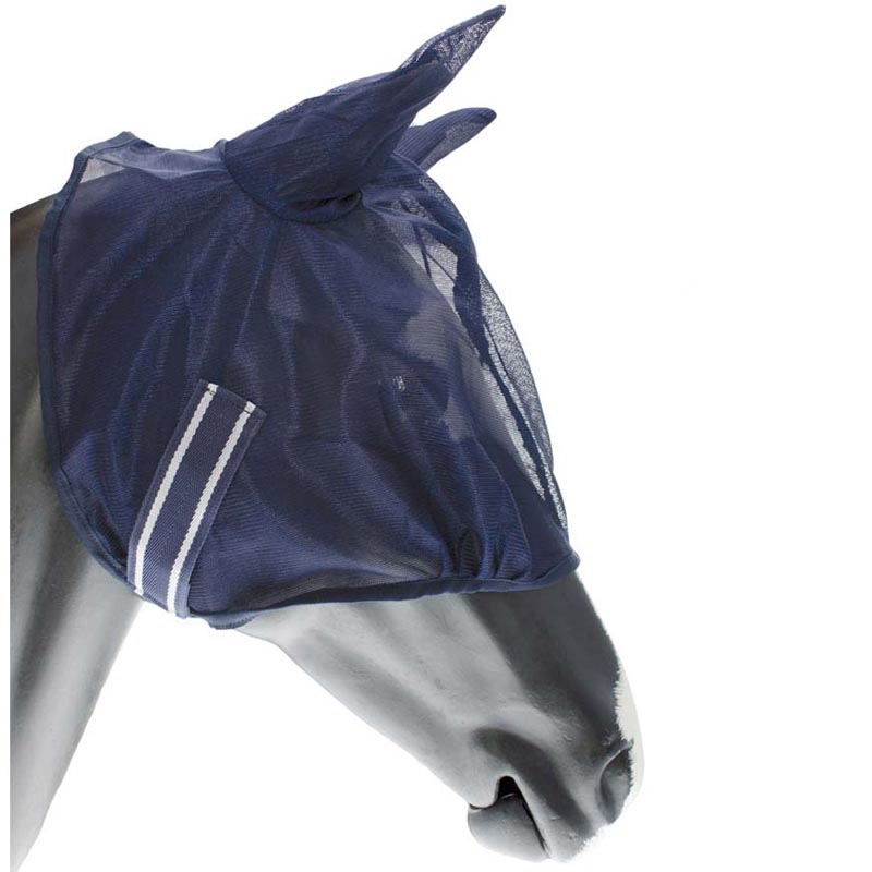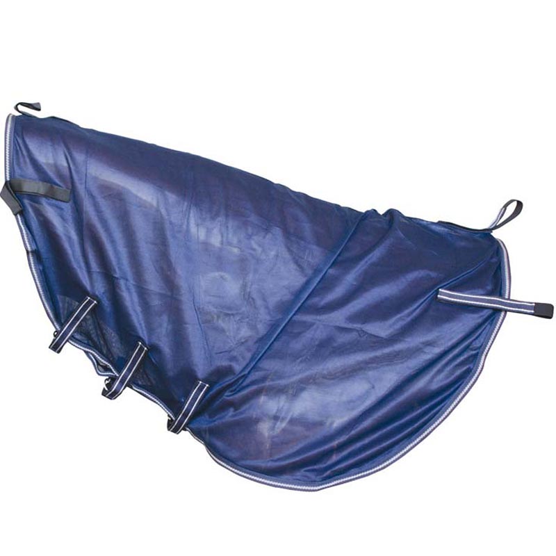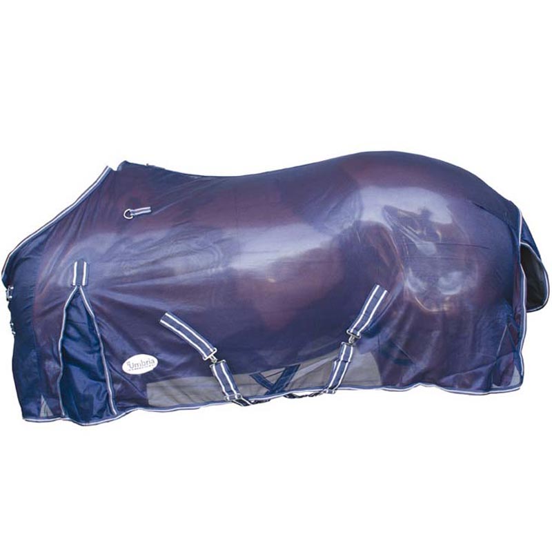 Complete mesh rug model Viana, with neck and mesh mask. Anti insect rug for horse with adjustable front closures, crossed straps, anatomic lateral bellows. Sold together with the fly mask and neck coordinated. Blue Navy color.