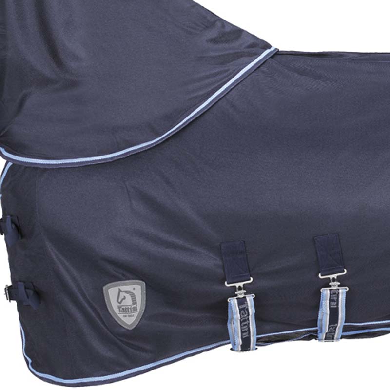 Tattini mesh summer rug with detachable high collar. Mesh cover for horses, for summer or hot seasons, to protect from flies, horseflies, flying insects preventing eczema and all skin disorders derived. Net thin weft with small holes, with protection at the withers, in synthetic lamb. Blue color, with light blue edges, adjustable and removable neck. The girdle has 3 adjustable straps to protect the abdomen, front closure with buckles, wide tail cover, Tattini shield with logo on the shoulder.