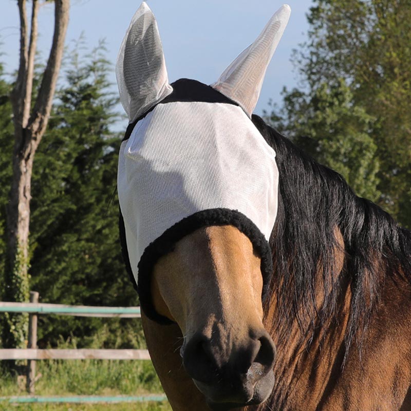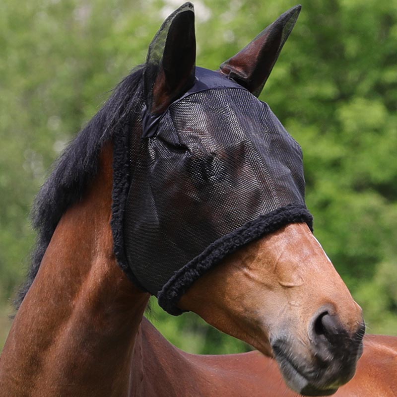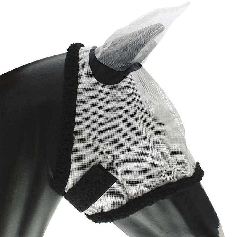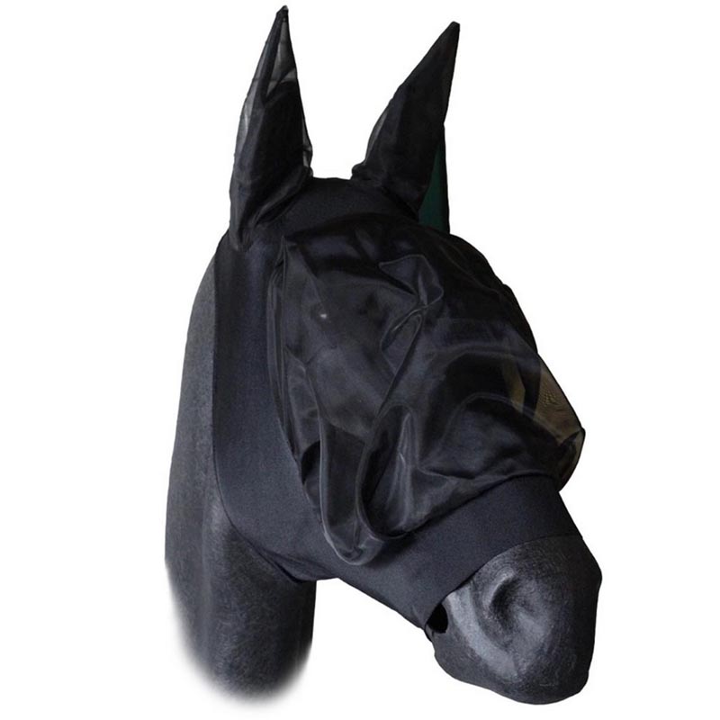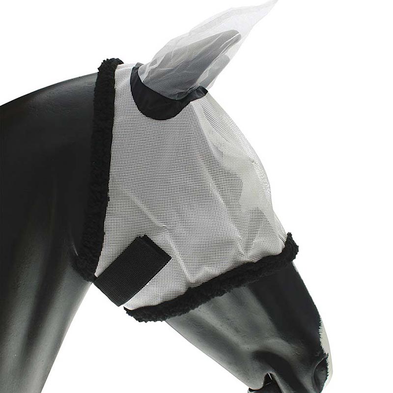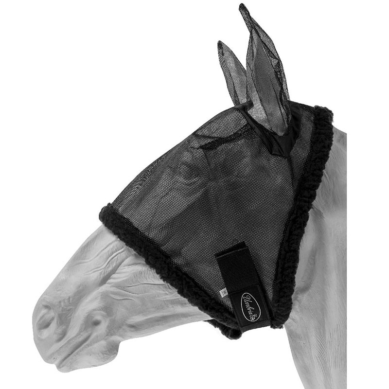 Nylon fly mask with earflaps, velcro closure.