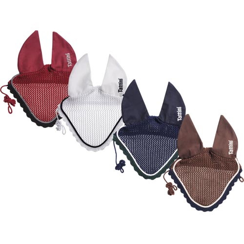 Bonnet ear net Tattini with embroidery, bicolor cotton crochet. Horse earnet with ear covers, with Tattini embroidery trimming and cord contrasting color.