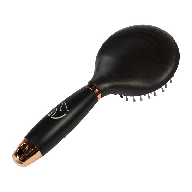 Ergonomic HKM brush for mane and tail care, from the Gel line, featuring an ergonomic and non-slip grip. This brush is perfect for detangling and grooming the horse's mane and tail, ensuring a smooth and well-kept appearance. The gel handle provides a soft and comfortable grip for effortless use. Colorful and metallic details add a stylish touch.