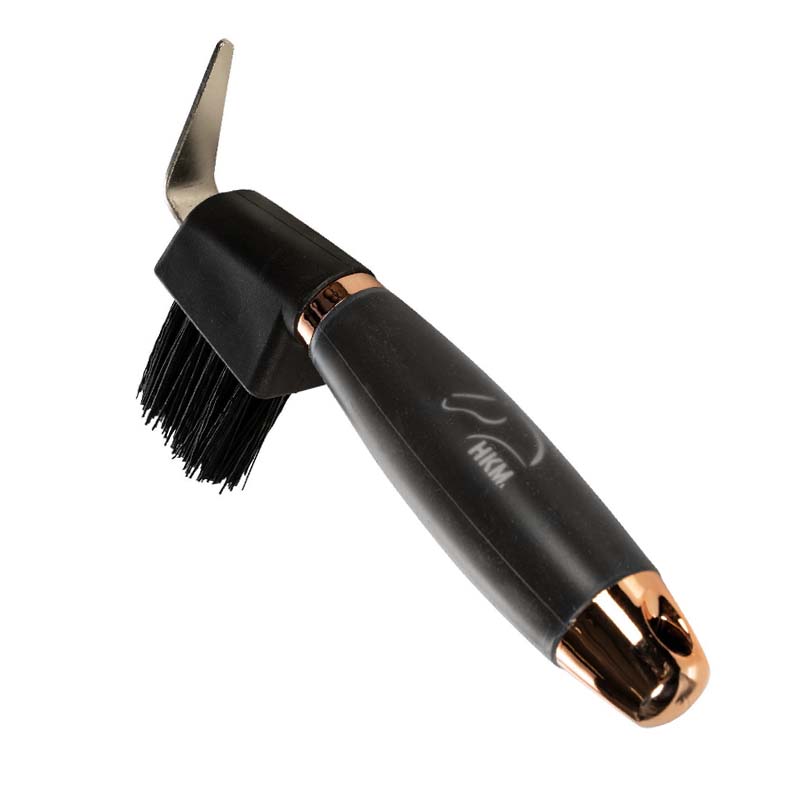 HKM Gel Line hoof pick with curved stainless steel tip and stiff-bristle brush for horse hoof cleaning. This hoof pick is designed to effortlessly remove dirt, mud, and debris from the horse’s hooves. The long, curved stainless steel tip allows for deep cleaning, reaching even the most difficult areas, while the stiff-bristle brush helps to effectively clean the sole and frog. The ergonomic gel grip ensures a comfortable, non-slip hold, making grooming easier and more efficient. Material: Stainless steel (tip), Plastic and rubber (handle and bristles).