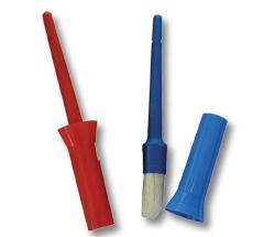 Brush with soft bristles and cap with plastic handle.