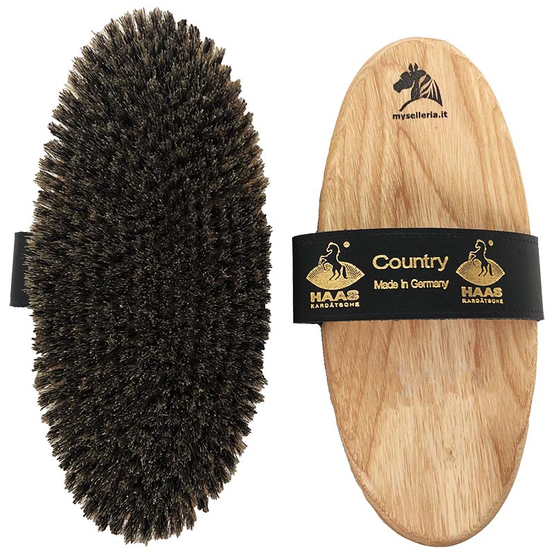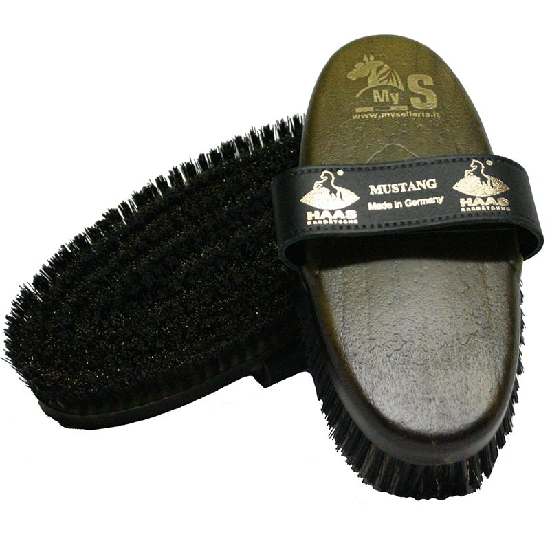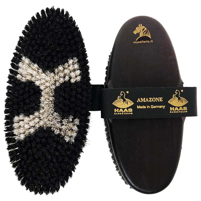 Brush Haas for the horse, shaped with natural bristles high and soft, Noir model. Excellent for removing dirt and fine dust in the final step of grooming. Dimensions 21x6cm back, 5cm height bristles.