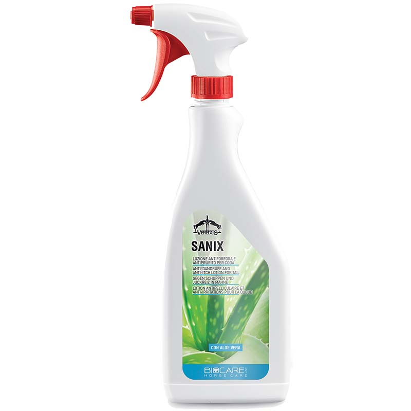 Veredus Sanix dandruff and anti-itching lotion for mane and tail. Lotion for horses, which combats dandruff and itching of the mane and tail. To be used after proper cleaning, to remove bacteria and dandruff, to be applied and massaged on the affected areas. Remove the cause of the itching and rubbing of the horse. Repeat daily until the disappearance of the symptom. For external use only, do not apply to wounds and mucous membranes. This solution has been specifically designed to normalize and treat hygienic and biological the root of the hair and horsehair. 500 ml bottle.