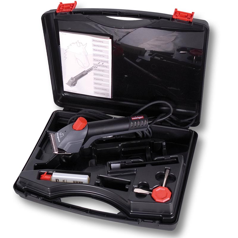 Progress Heiniger clipper professional for horse, very light, ergonomic and quiet. Recommended for sensitive and nervous horses. This model has a safety device against overload, no air outlet that can annoy the horse. Supplied in carrying case kit with blades, screwdriver, lubricating oil, brush and manual.