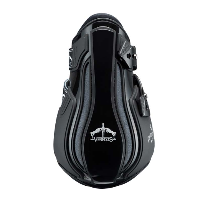 Shock-absorbing fetlock boots Veredus Pro Jump Active, designed for show jumping competitions with adjustable elastic closure. The Veredus Pro Jump Active boots are made of polyurethane, featuring a rigid outer shell and a soft neoprene lining with a Lycra border to provide maximum protection and shock absorption against impacts. These fetlock boots support the horse’s hind legs, enhancing propulsion during jumps. The Pro Jump Active fetlock boots can be used during official Show Jumping and English Riding competitions, in compliance with FEI regulations. The quick-release closure with adjustable elastic straps (four sizes available) ensures a secure and stable fit. • Show jumping hind leg protection with shock-resistant shell • Quick-release closure with adjustable elastic straps • Enhances hind leg support during jumping and galloping • FEI compliant for official Show Jumping competitions