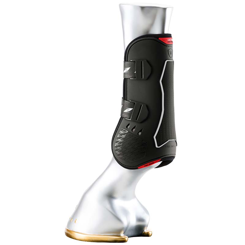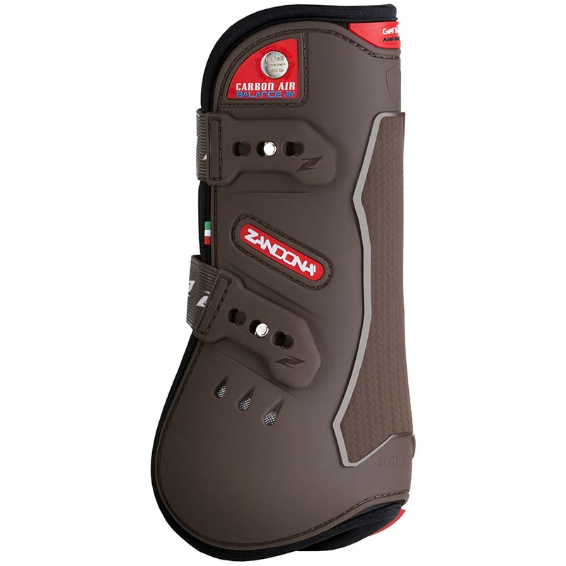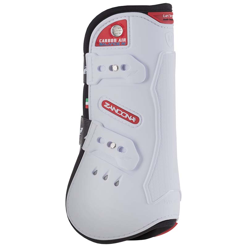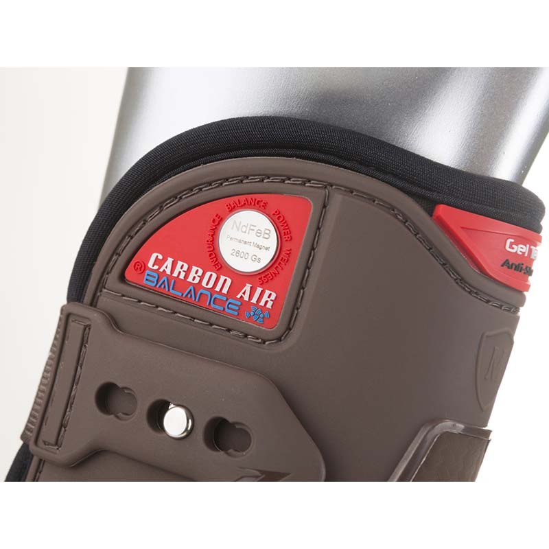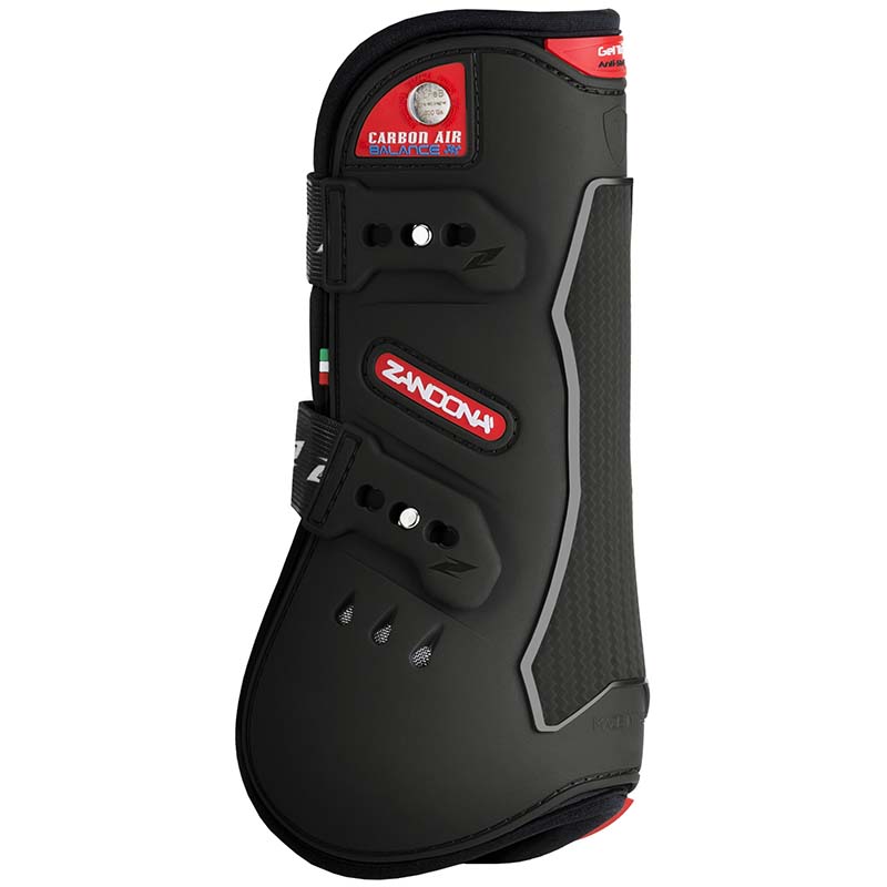 Tendon boots Zandonà model Carbon Air Balance with magnetic device. Externally made of TPU, with differentiated thickness, support in perforated neoprene and equipped with ventilation outlets on the fetlock. Gel-Tech membrane to absorb shock and cushion for comfort. Shell with Carbon fiber elements, for thermally insulate the joints from the heat generated by friction, and to increase the mechanical resistance to impacts. Closing elastic straps with quick-release tip, suitable for a secure closure. This model is provided with a magnetic device that increases the dynamic balance of the horse improving cellular functions. It has been reported that this magnetic induction, placed in a strategic point of the limb, decreases substantially muscle fatigue as it facilitates lymphatic circulation due to an increase of the vascular blood flow. Thanks to this device is guaranteed an improvement in the performance of the horse. Certificate Ricotest. Product completely realized in Italy. Price is intended for the pair.