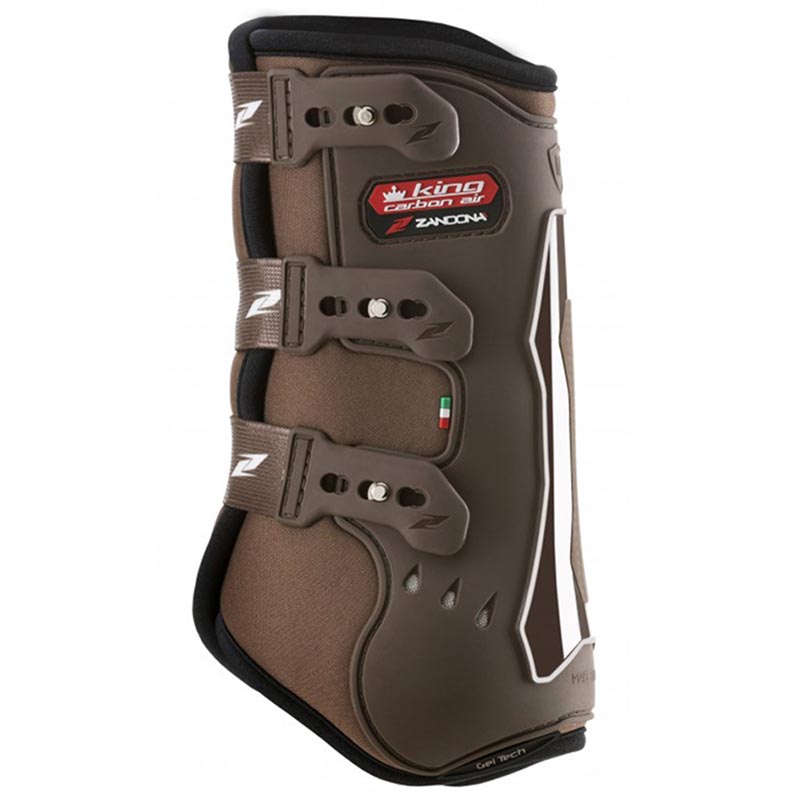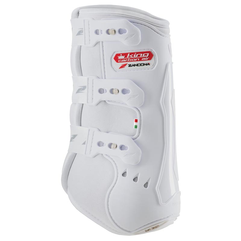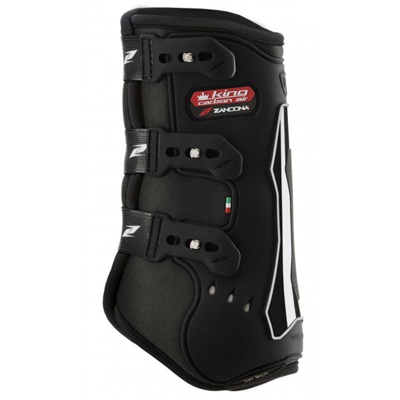 Tendon boots Zandonà DRESSAGE model KING Carbon Air Front. Externally made of TPU, with differentiated thickness, support in perforated neoprene and equipped with 6 ventilation outlets on the fetlock. Gel-Tech membrane to absorb shock and cushion for comfort. In the outer zone of the pastoral, there is an area specially designed for flexibility (Flex Zone), the size and shape have been specifically designed to be more ergonomic as possible. Shell with Carbon fiber elements, for thermally insulate the joints from the heat generated by friction, and to increase the mechanical resistance to impacts. Closing elastic straps with quick-release tip, suitable for a secure closure. Certificate Ricotest. Product completely realized in Italy. Price is intended for the pair.