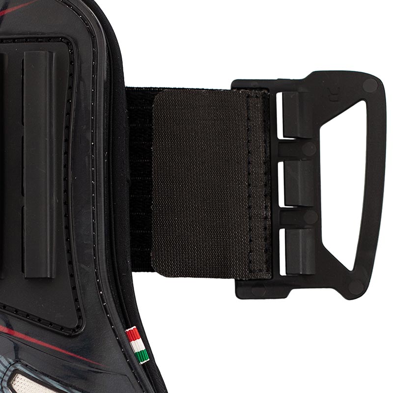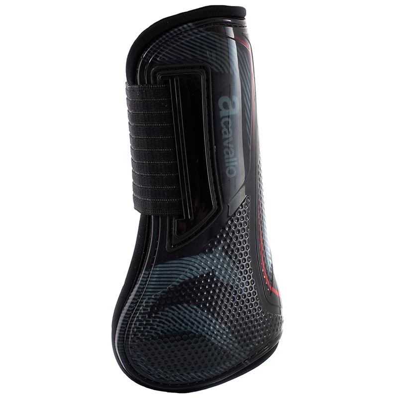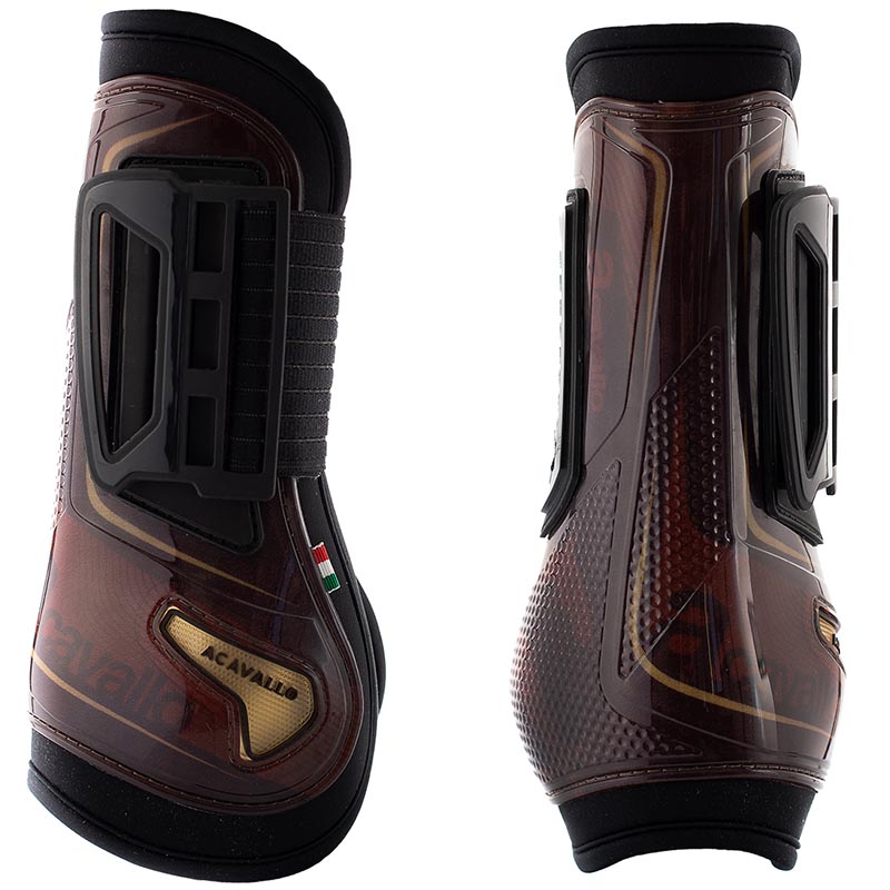 Tendon boots Acavallo model Opera, coupling EClick with gel padding shock-proof. The new patented locking eClick facilitates the coupling and uncoupling of the boots, even with gloves, a single center elastic band is adjustable with Velcro, to fit in the best Way the legs of every horse. The soft neoprene interior liner is flanked by a perforated structure gel slip to give maximum comfort to the horse. The wide band closing and the gel also give stability and freedom of movement. The special gel shock-absorber also easily absorbs impacts and facilitates the movement of the air, coming out through the side vents grille.