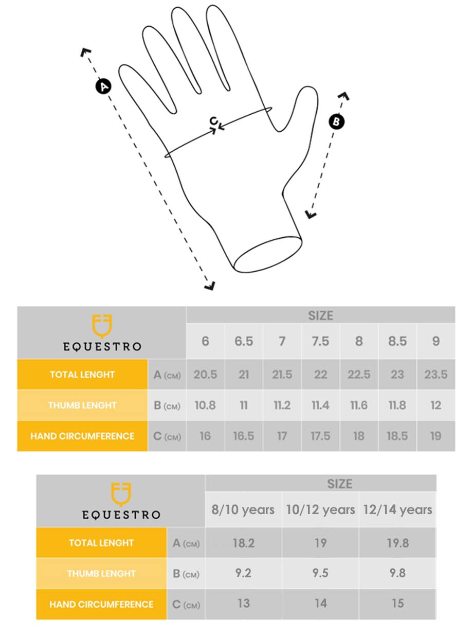 Equestro Sunny riding glove with ultra-grip breathable fabric. Riding gloves in ultra-breathable technical fabric for the back, with Velcro closure, and gripping inserts in polyurethane on the palm and fingers.