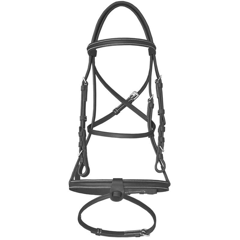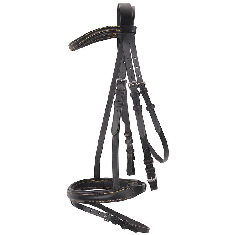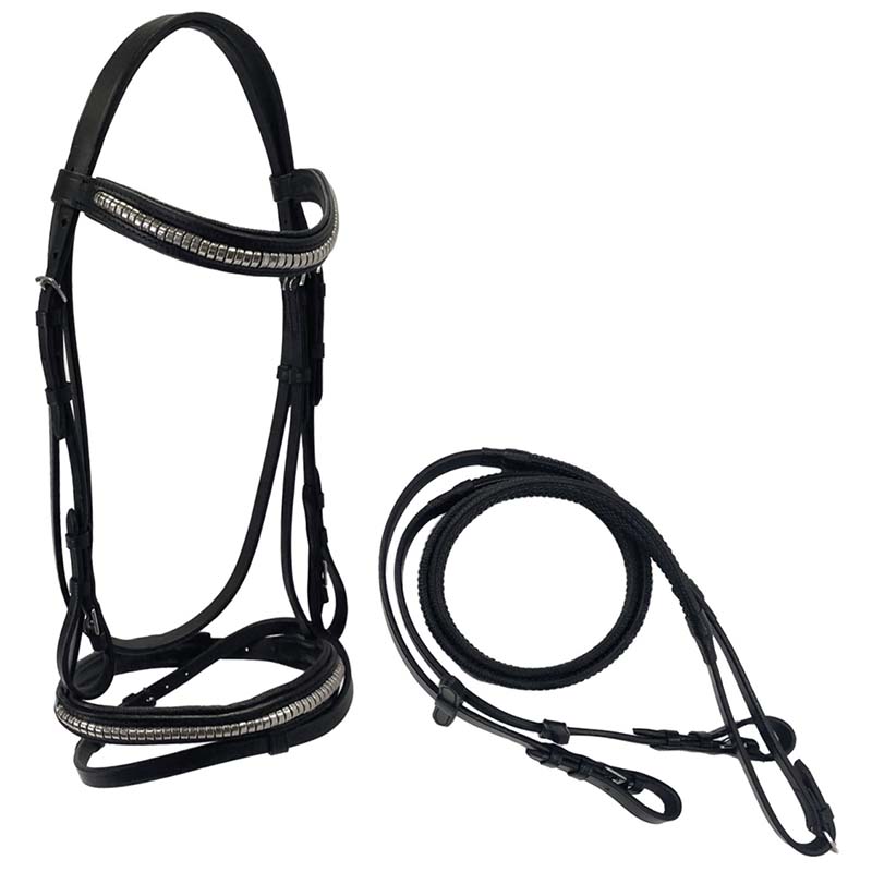English pvc bridle with nylon band core, lined and padded with anti-irritating synthetic material, rubber covered reins, stainless steel buckles.
