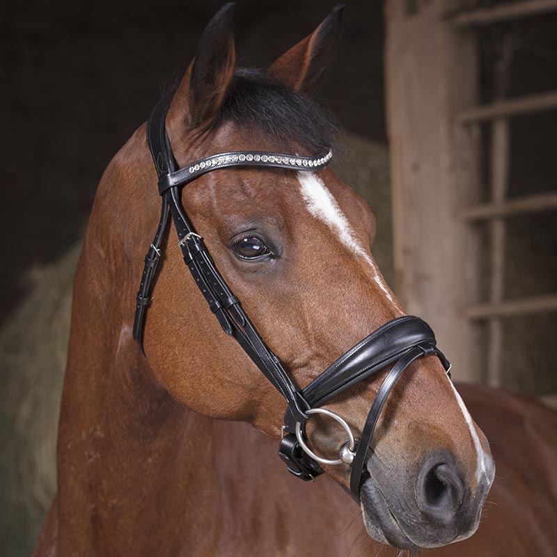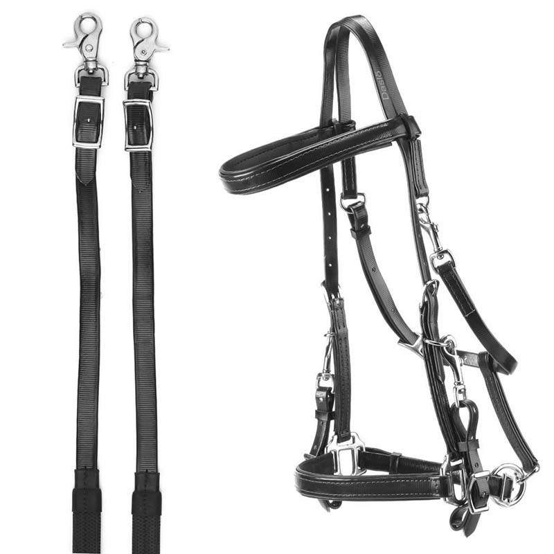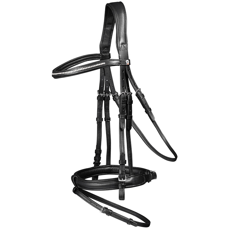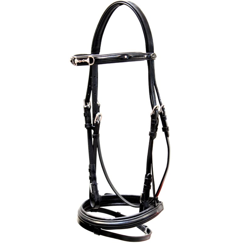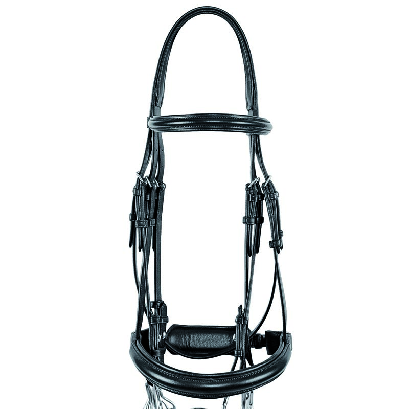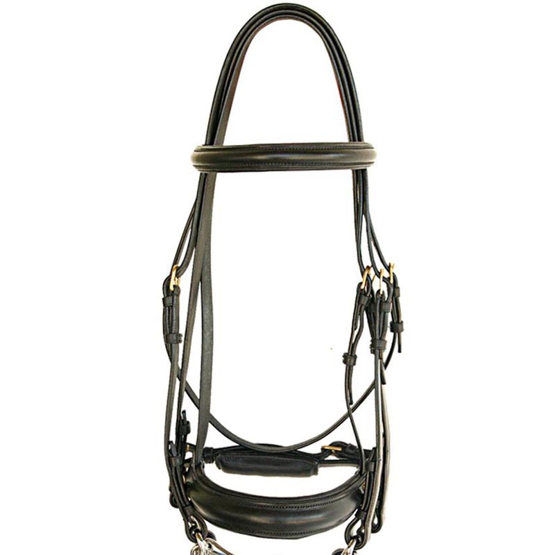 Good-quality UKE leather English dressage bridle for bite and thread with double smooth leather reins.