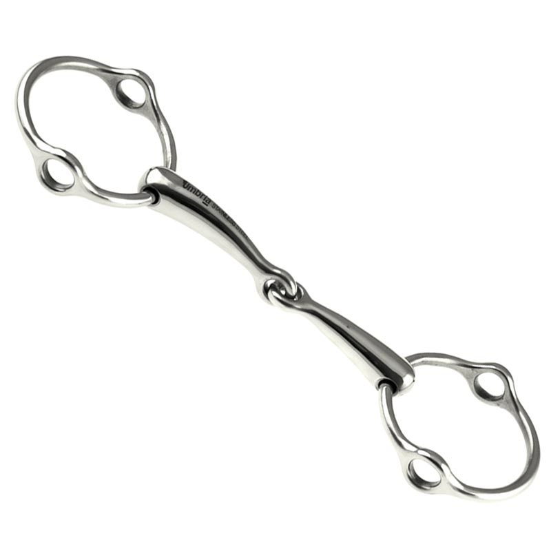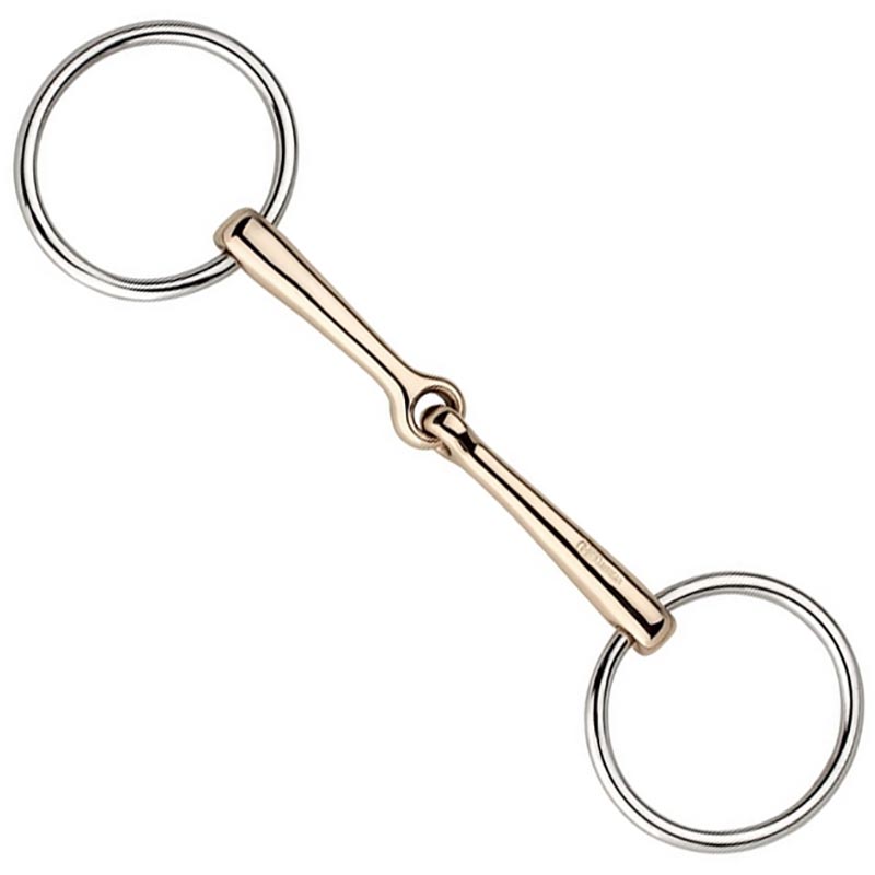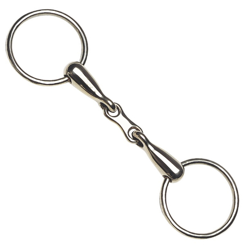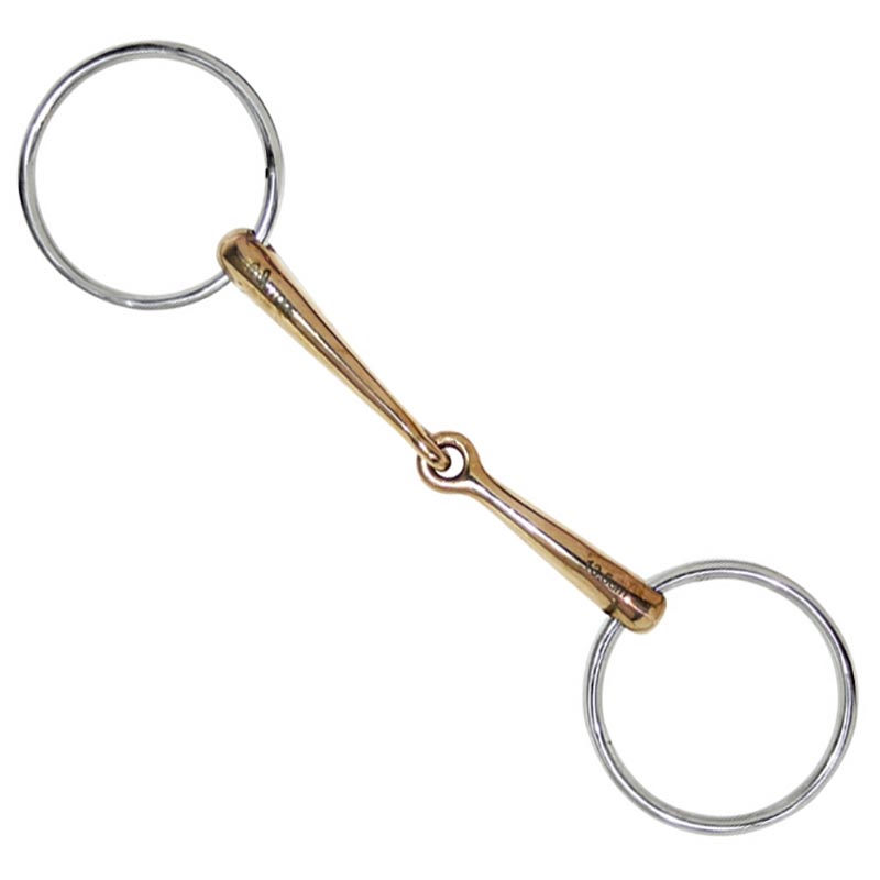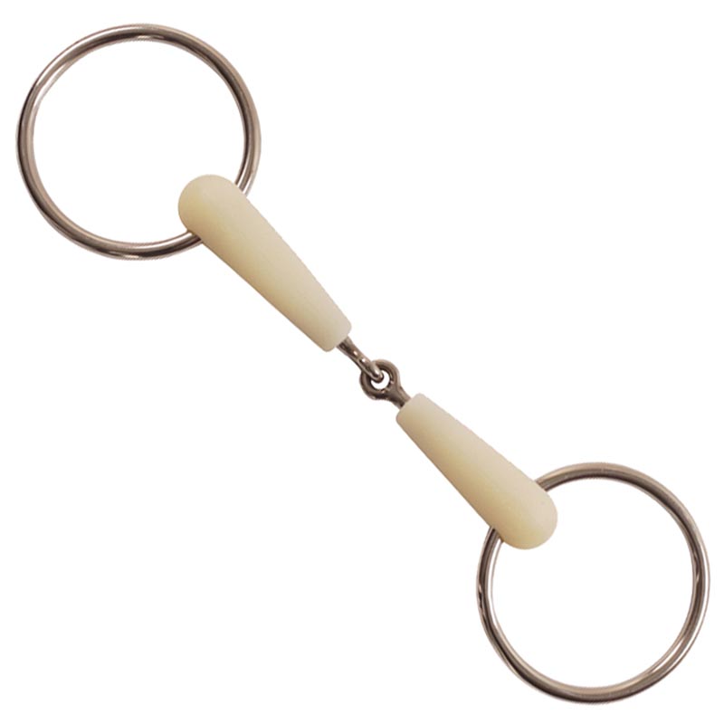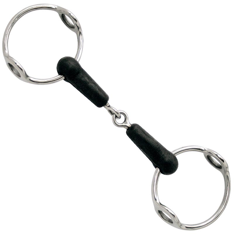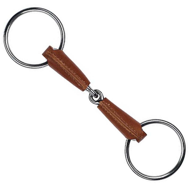 Snaffle jointed bit, stainless steel, with mouthpiece covered in leather. The cannons of the snaffle have been covered in leather.