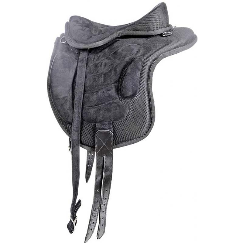Saddle suede for trekking Norton Treeless without tree. Saddle composed of a base and seat padded detachable with Velcro, with a removable medium gullet, in this way can easily adapt to any horse that has a withers problematic, that it is round or too pronounced. Foam structure, covered with suede leather, the bottom is lined with synthetic fleece. Two front and three rear rings to attach saddlebags or laces.