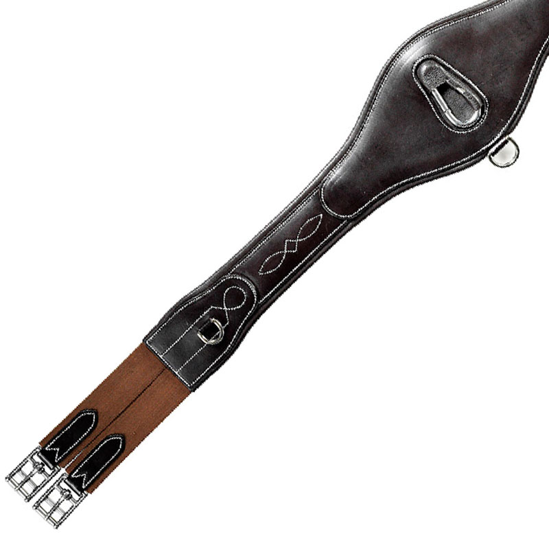 Candy shaped saddlegirth Tattini in leather, realized with first quality 100% vegetable tanning, chrome free, hypoallergenic, and without harmful substances. Provided with central carabiner, elastic on both sides and stainless steel buckles.