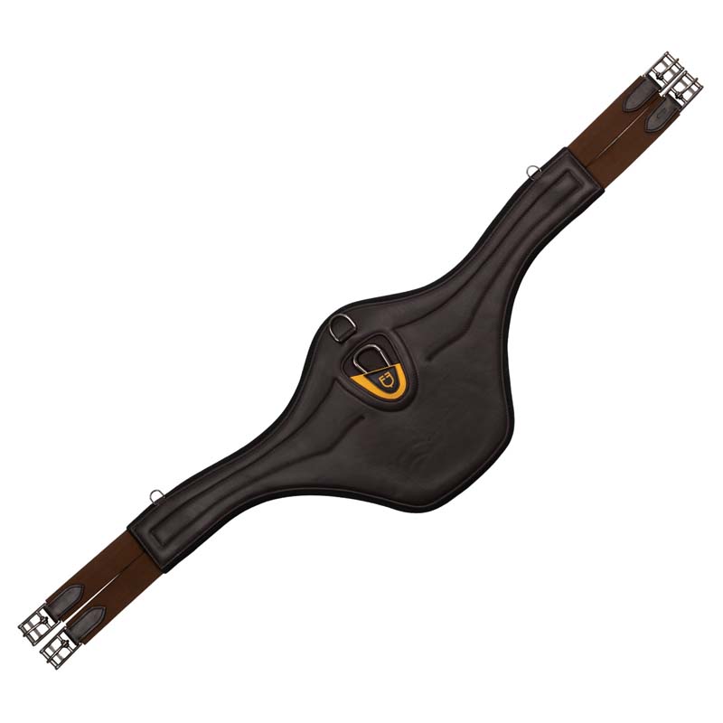 Equestro jumping girth with stud guard for English riding, made of genuine leather with neoprene lining and a breastplate attachment hook. The Equestro jumping girth is crafted from soft and durable leather, featuring stainless steel buckles and side elastic inserts that allow for easy adjustment and a perfect fit. The front stud guard protects against injuries and impacts that may occur during work. The hook allows for secure attachment of a breastplate. The inner part of the girth is lined with neoprene to prevent rubbing on the horse's skin.