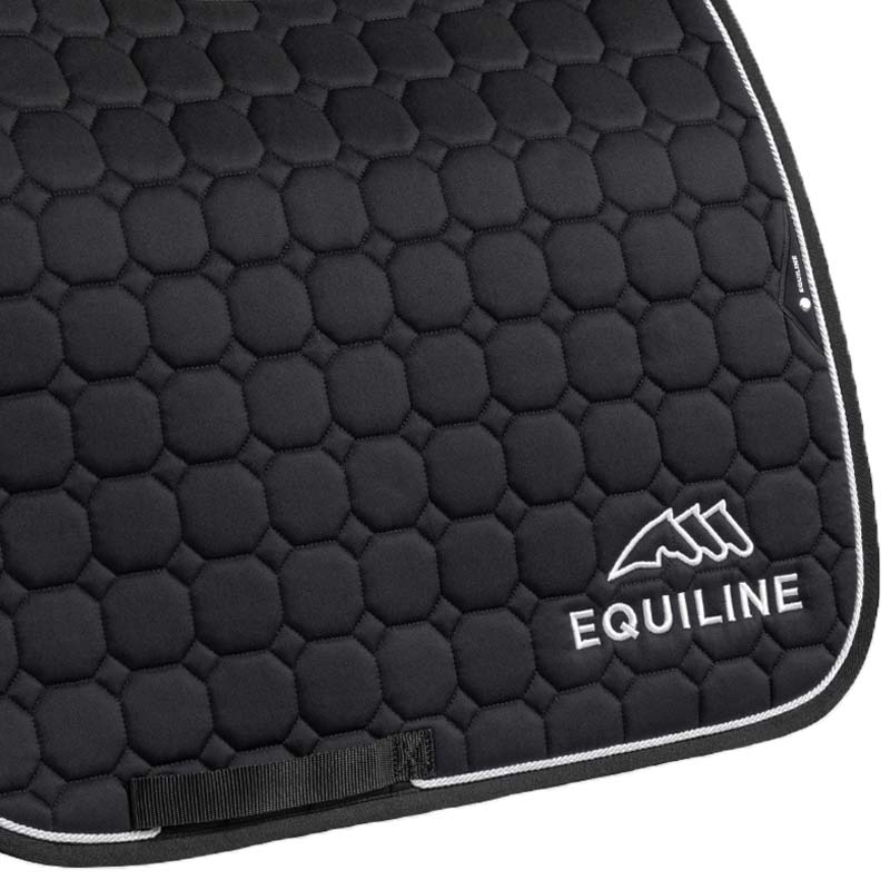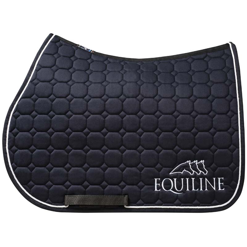 English saddlecloth Equiline model Outline, with embroidered logo Equiline. In ACS2 material composed of inner layer 100% soft cotton, padded with pure wadding 900gr. that allows maximum breathability and exceptional shock absorption effect. Always maintain adequate thickness between the saddle and the horse's back. Preshrunk and anti-allergic fabric, the inner lining is in natural ecru color, to prevent the colorants from coming into contact with the horse, contributing to an even greater respect for the environment.