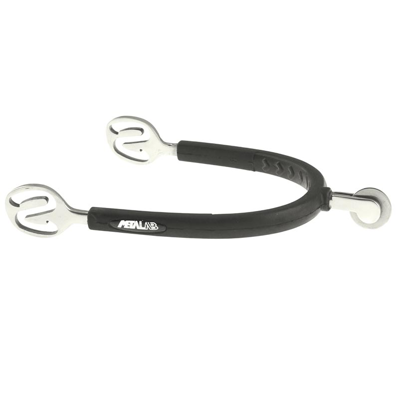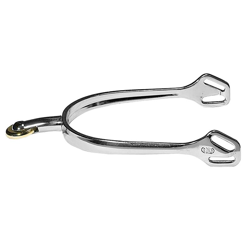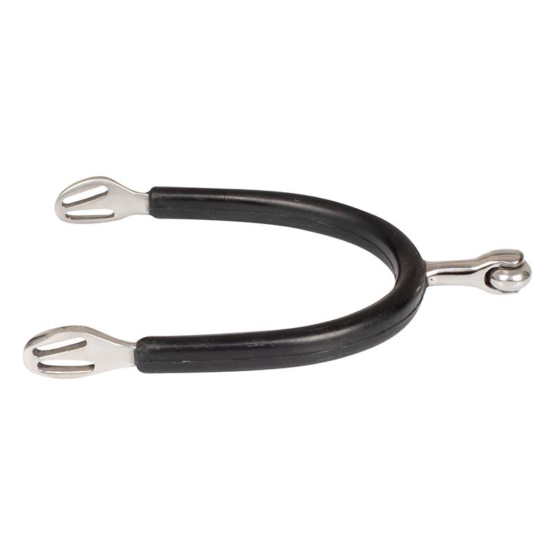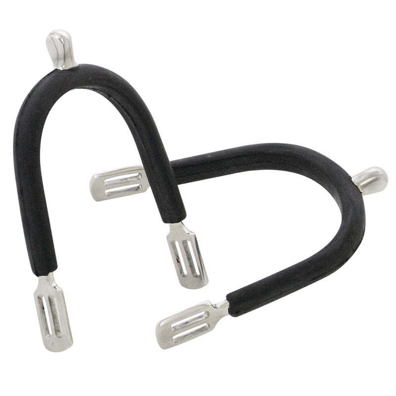 Pair of english spurs Stainless steel, shank drop, coated with rubber grip. The rubber grip adheres perfectly to the boot and keeps the spur in position.