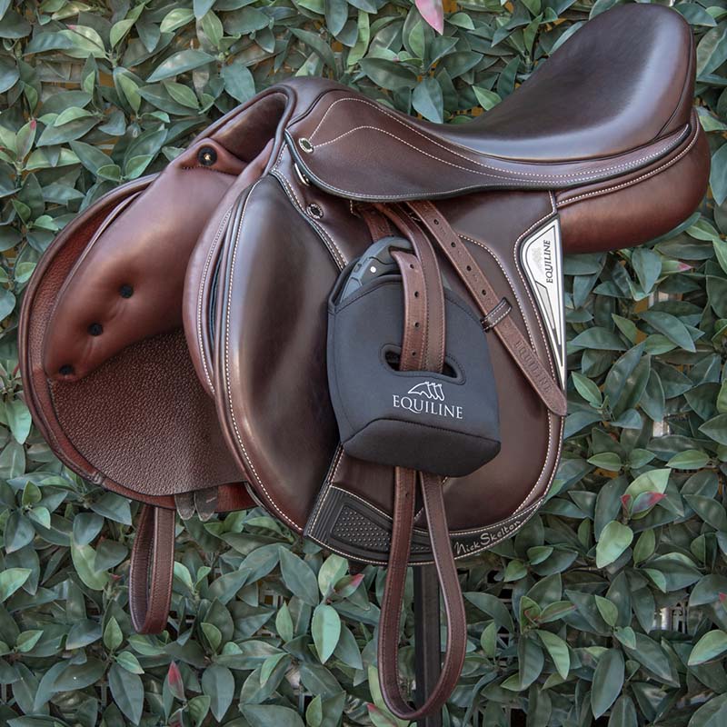 Neoprene stirrup covers with printed Equiline logo, ergonomic and universal design compatible with English riding stirrups. Made from 100% polyester, these Equiline stirrup covers protect your favorite riding stirrups from scratches and wear. The ergonomic and universal shape makes them compatible with most English riding stirrup models. The central hole allows the stirrup leathers to be inserted, so the covers can be used even with the stirrups already mounted on the saddle. One size. The price is for a pair.