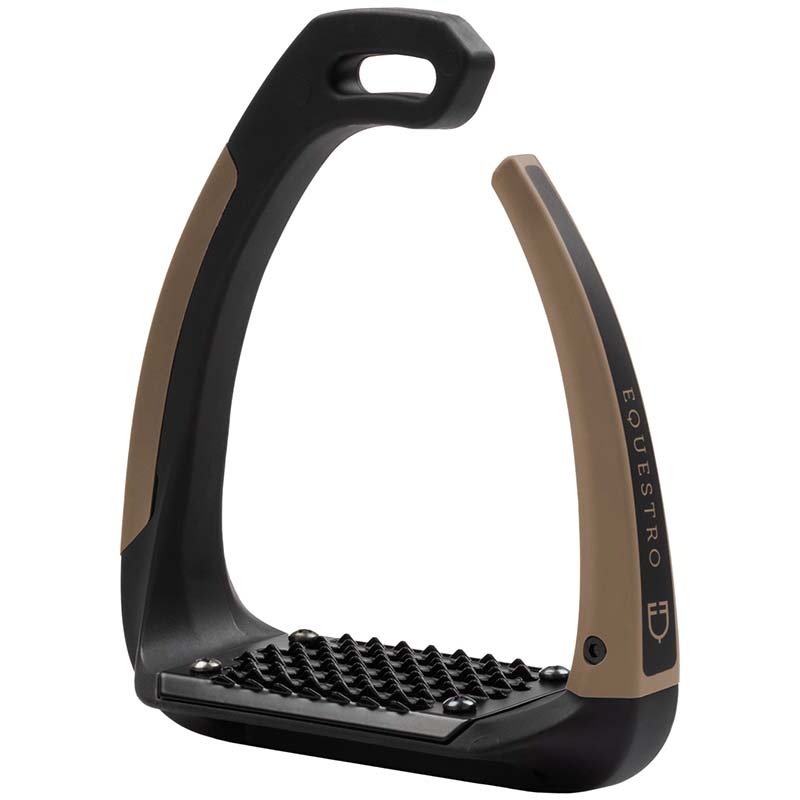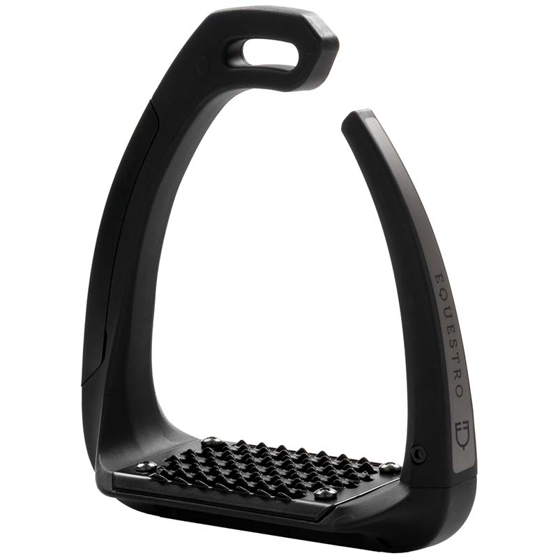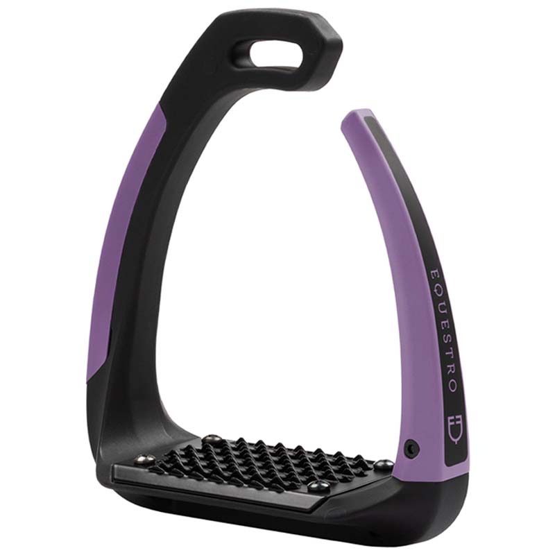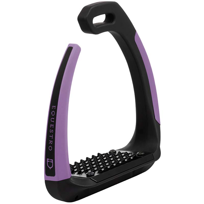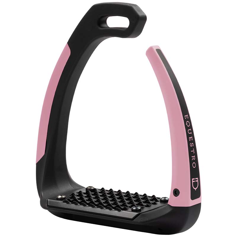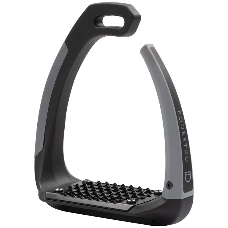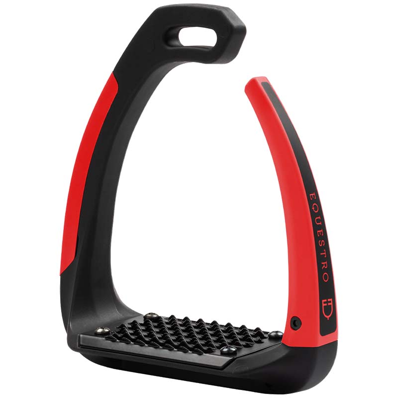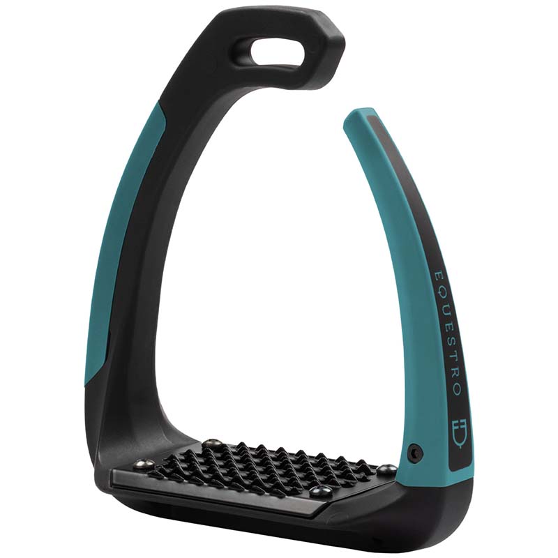Equestro stirrups for English riding, Supernova model, featuring a flexible silicone side opening and interchangeable colored cover. Footbed size: 12.5 cm. The Equestro Supernova stirrups are an innovative model with a modern design. Made of durable metallic materials and silicone, they feature a flexible arm with a side opening (up to 105 mm) that allows for quick release of the foot in case of a fall or emergency, reducing the risk of being trapped in the stirrup. The wide footbed, 12.5 cm in length, provides ample support for the foot, ensuring stability and grip thanks to the textured surface. Openings on the tread prevent the accumulation of sand and dirt. The Supernova stirrups are customizable and adaptable to your preferences: the colored cover on the arm can be independently swapped out, with various options available in the Related Items section below.