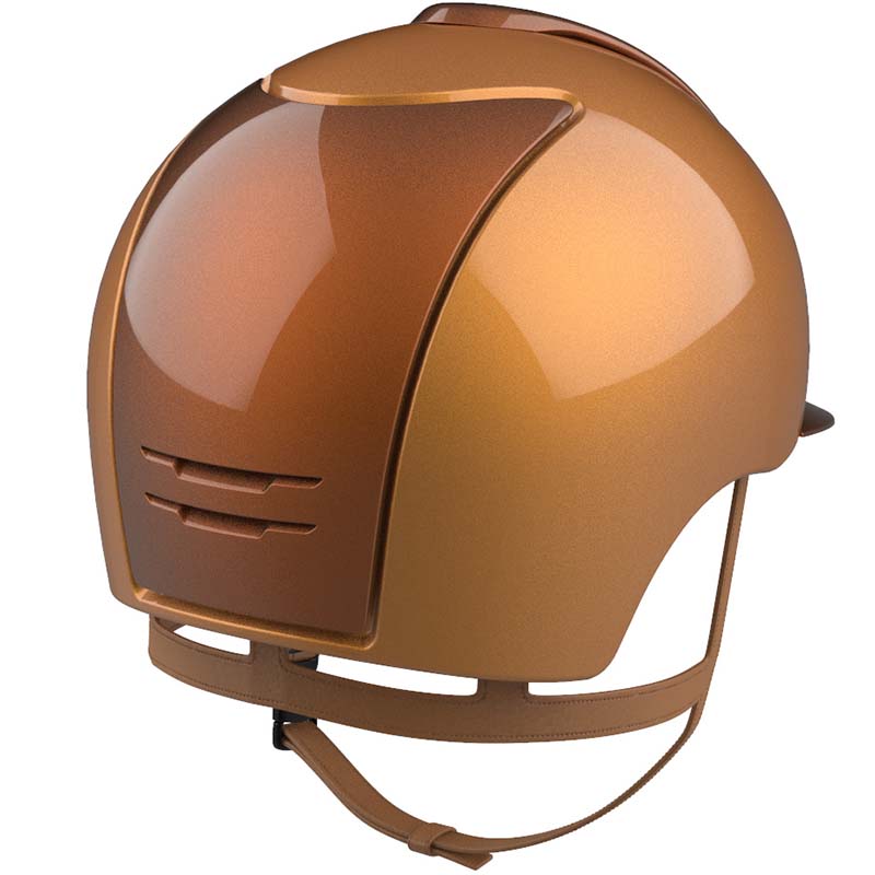 Helmet Kep Italia model Cromo 2.0 Metal Caramel with glossy inserts. The model of the helmet is the "CROMO", in particular, this model has the cap entirely glossy and metallic, with insert in the front, the grille and visor painted shiny tone on tone. Three-point attachment, soft leather with laces, also colored in tone.