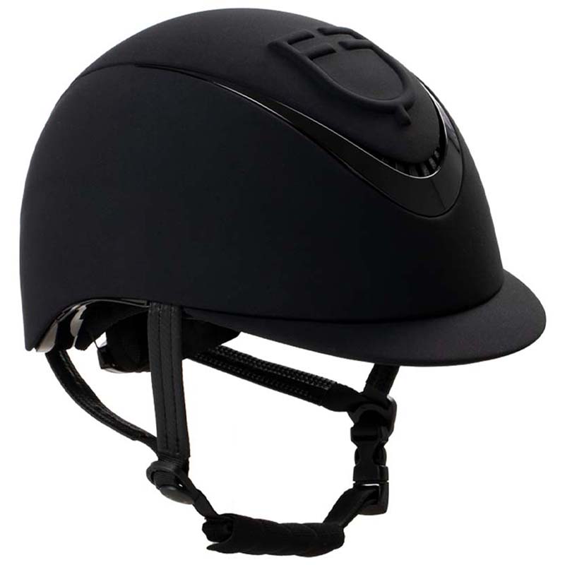 Unisex Equestro riding helmet with embossed logo on the shell, covered in fabric with glossy trim, standard visor, and adjustment system with rear rowel. The Equestro Unisex Helmet with embossed logo guarantees safety and style for both male and female riders. The rear adjustment dial allows for a custom fit, ensuring the helmet stays secure and stable on the head thanks to the eco-leather chin strap. The soft, breathable inner padding is removable for easy maintenance and cleaning. The shell of this Equestro helmet is covered in technical fabric, weather-resistant and with a unique matte effect contrasting against the glossy trim on the ventilation grids. The embossed logo on the top of the shell adds distinction and style.