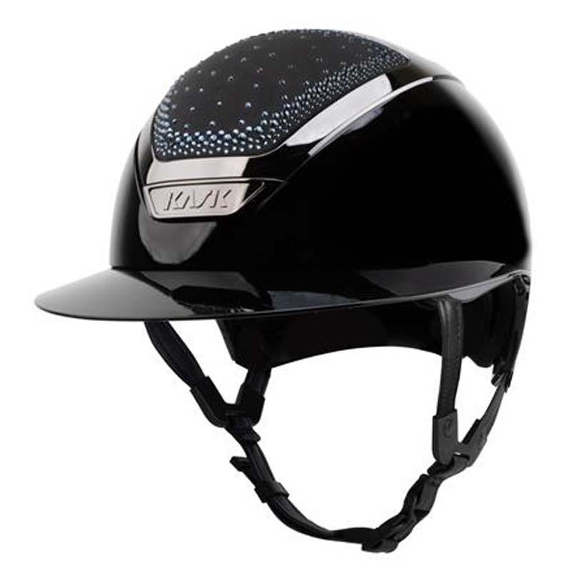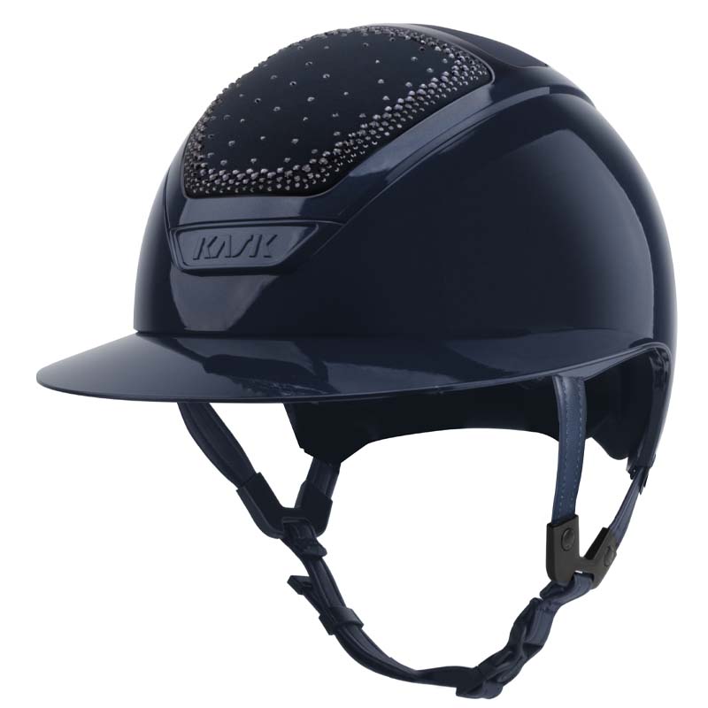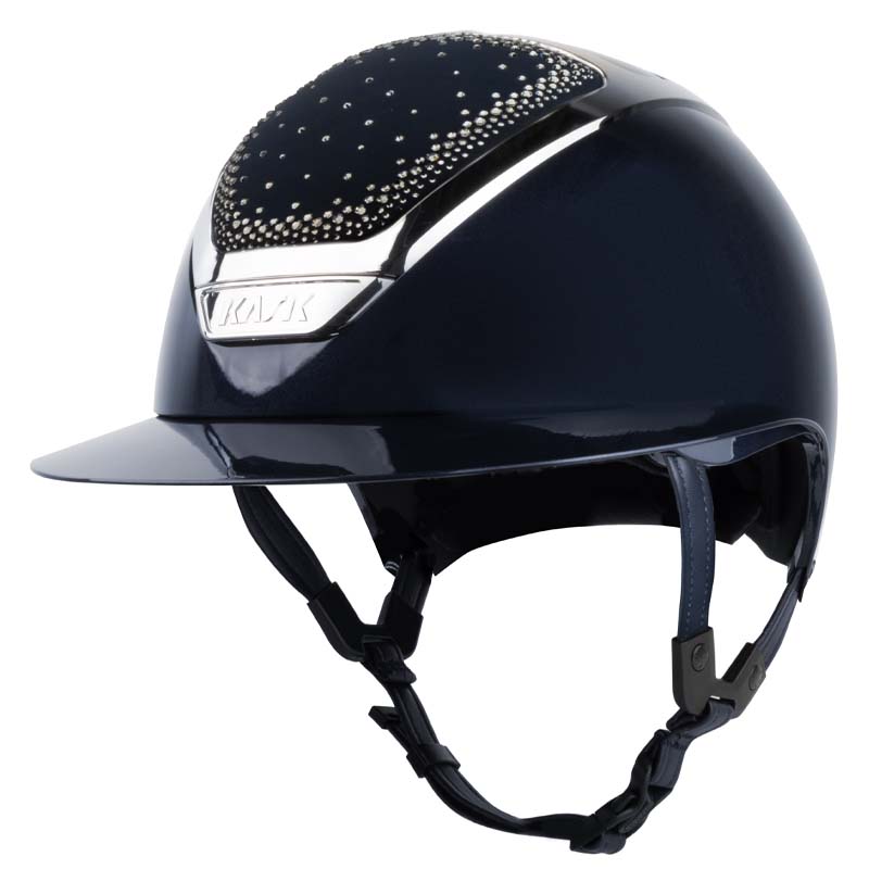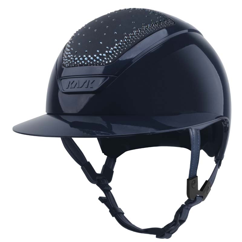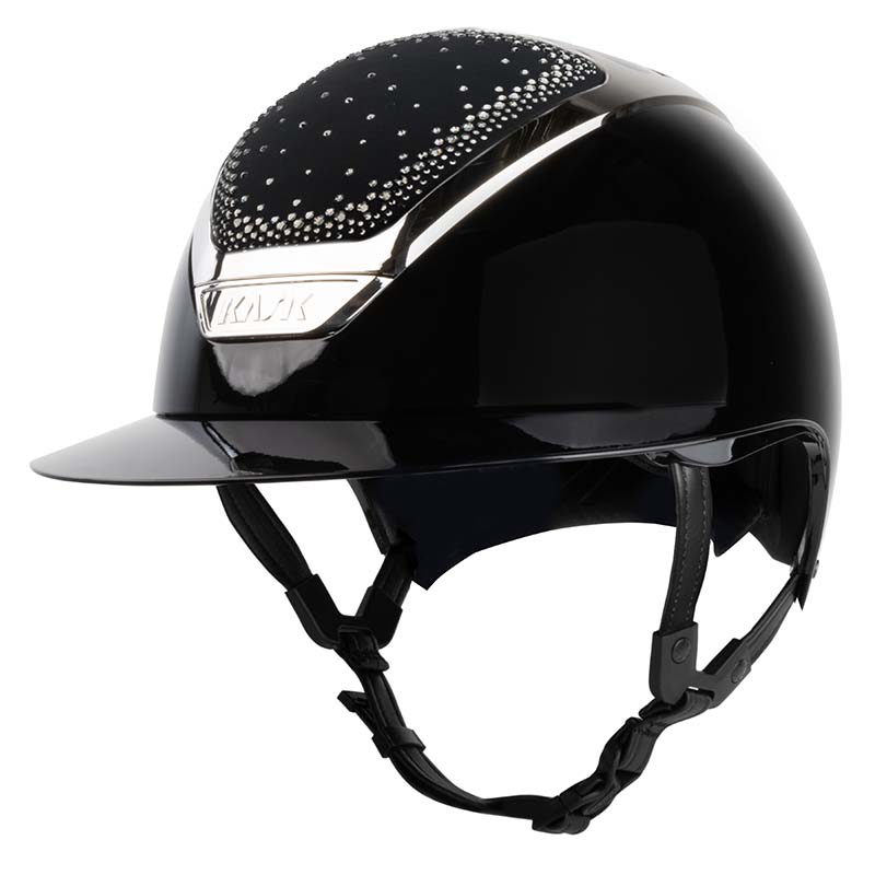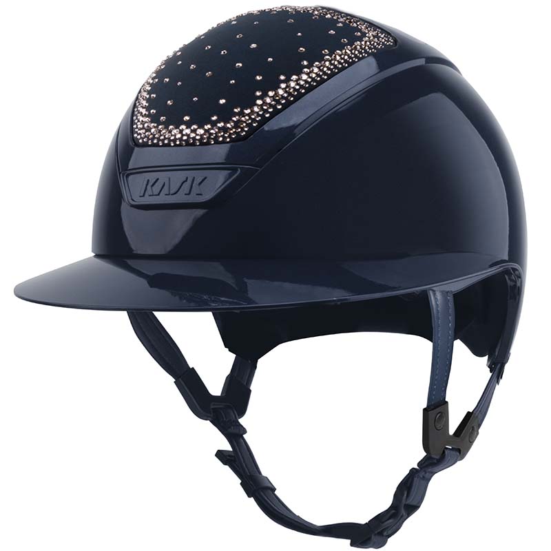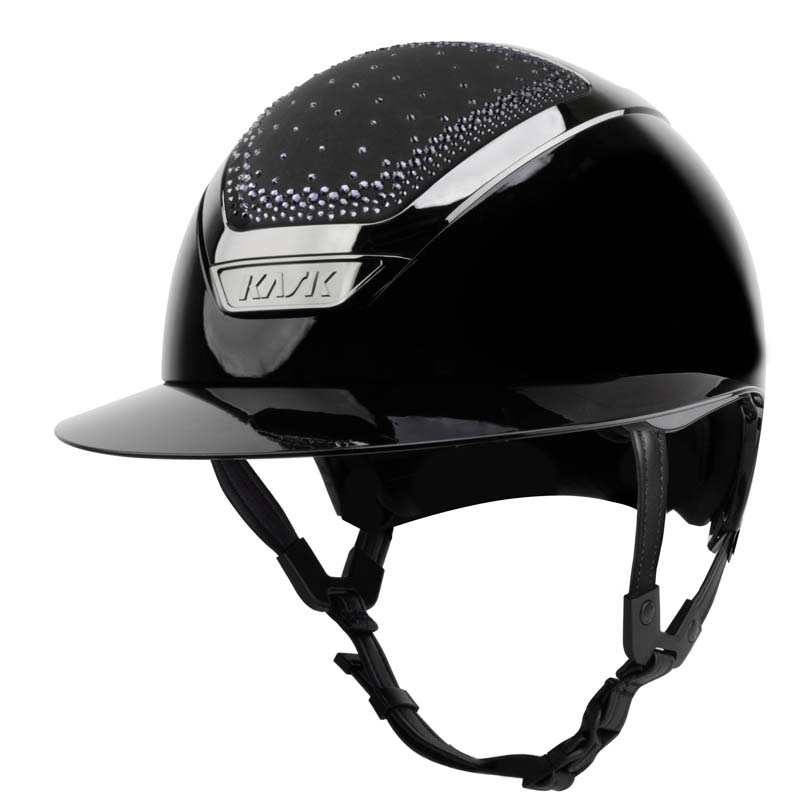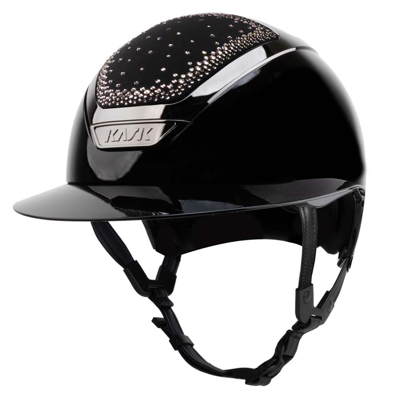 KASK Star Lady Pure Shine equestrian helmet, Anima collection, with customizable Swarovski In-Out crystals on the shell. The KASK Star Lady helmet is a glossy, wide-brim model, one of the most popular choices among female riders and English riding athletes. The new KASK ANIMA collection allows riders to personalize their helmet with a shower of Swarovski crystals on the shell, choosing from exclusive designs and four different colors: Diamond, Blue Montana Mix, Vintage Rose, Black Graphite. The Star Lady Pure Shine model offers the perfect balance of protection, comfort, and style, featuring a lightweight yet highly durable shell, an advanced ventilation system, and a highly breathable internal lining. The wide brim provides protection from the sun and weather, ensuring optimal visibility during riding and competition. The KASK helmet is 100% Made in Italy. Weight: approx. 570 g. It includes KASK carrying bag and removable inner padding. • Glossy shell (Pure Shine finish) with Anima In-Out crystal design • Ultra-light and impact-resistant ABS outer shell • Honeycomb ventilation system with a front grille for continuous internal airflow circulation • Shock-absorbing expanded polystyrene (EPS) inner shell, ensuring maximum head protection • 100% Merino wool lining, an antibacterial and breathable fiber providing a comfortable fit • Patented FIT system, ensuring a perfect adjustment to the rider's head and extra neck support • CE and SEI Standard Certifications: VG1 01.040 2014-12, ASTM F1163, with SEI Mark