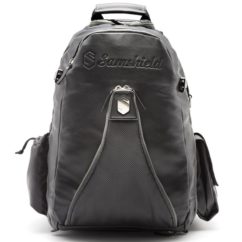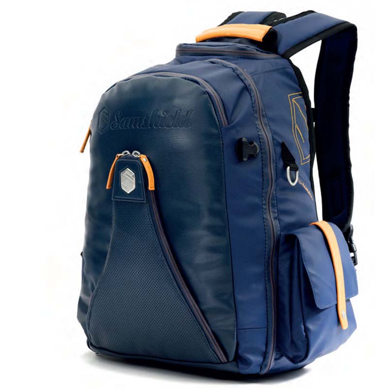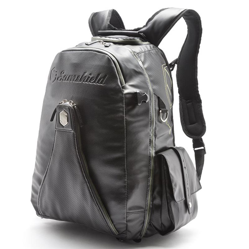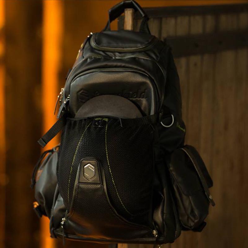 Backpack Iconpack Samshield, with leather insert. Stylish and generous backpack to safely hold your Samshield helmet and other accessories, with various compartments and inserts in imitation leather and technical fabric: side pocket for bottle or spray, side pocket closed with hook for small accessories. Large anti-rain zip pocket, padded for pc and tablet, and documentation. Elastic ribbon for fastening whip. Small top pocket for coins, gloves, keys or credit cards. Special pocket designed to protect your glasses, removable pouches for your cell phone or camera. Removable concealed net to hold helmet in position, additional retractable rain cover, adjustable and padded shoulder straps, top handle, comfortable two-sided zip, extra durable and anti-abrasion bottom. Transparent bin to enter owner data. Capacity 25 Lt. Coated in polyester 1200D, extra strong, durable and waterproof.