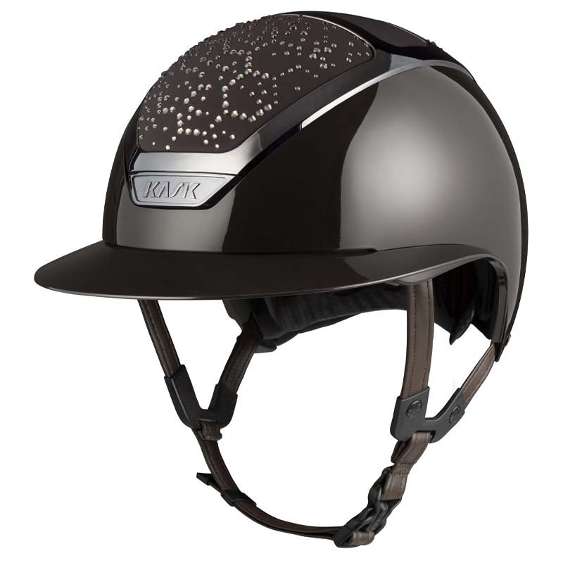 The KASK Star Lady ANIMA helmet is a premium wide visor model, appreciated by riders who seek elegance and safety, especially for high-level competitions. The front and rear parts of the shell are covered in fabric and decorated with crystals in the Vibe configuration, featuring a distinctive honeycomb-style design. The helmet can be fully customized, choosing between glossy or matte finish and 3 different Swarovski colors: Montana Mix, Graphite Mix and Greige.