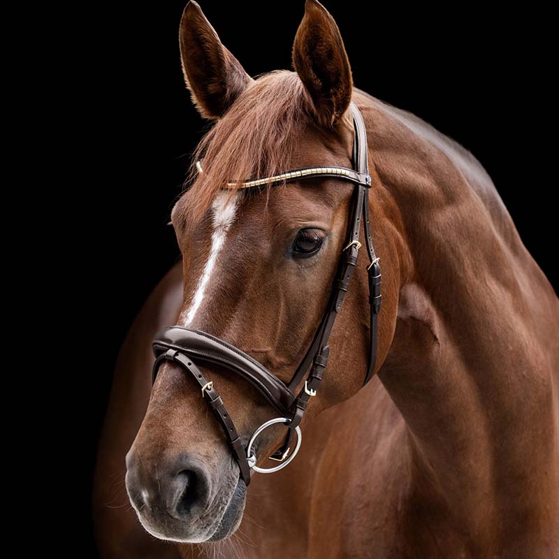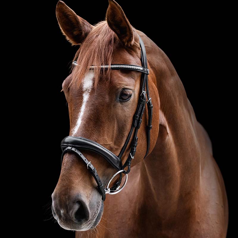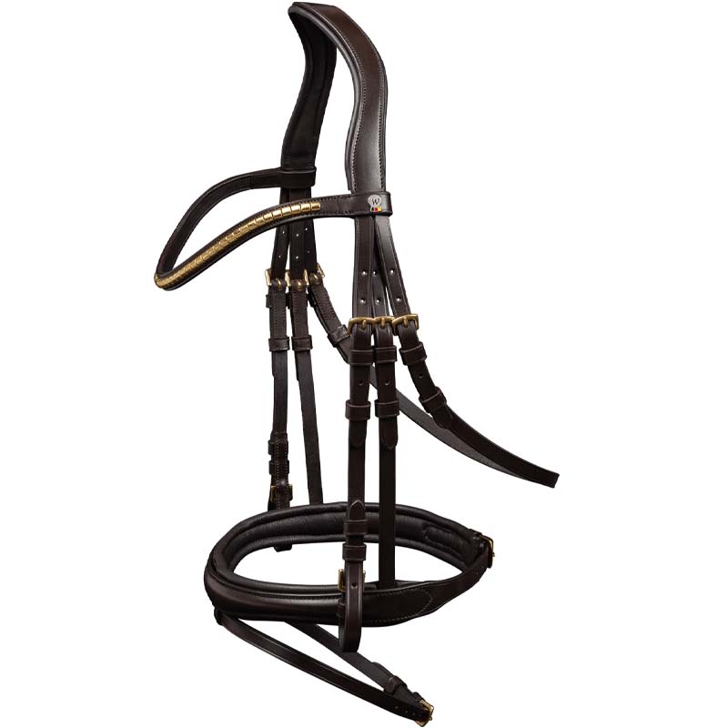 Adjustable Waldhausen X-Line English bridle with Clincher browband, combined noseband, and anatomical headpiece. The Clincher bridle from the Waldhausen X-Line collection is designed for comfort and stability. The anatomical headpiece helps to distribute pressure evenly, while the padded noseband and browband reduce friction. The shaped browband with metal clincher adds a classic and elegant touch. The removable and adjustable flash strap allows for a customized fit. Stainless steel buckles ensure durability and strength.