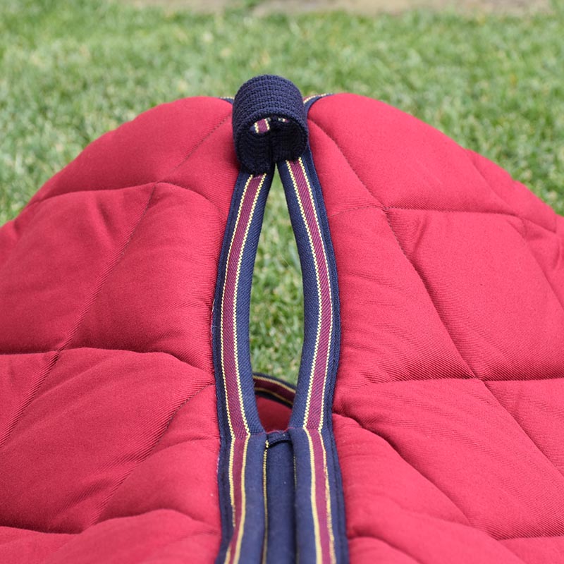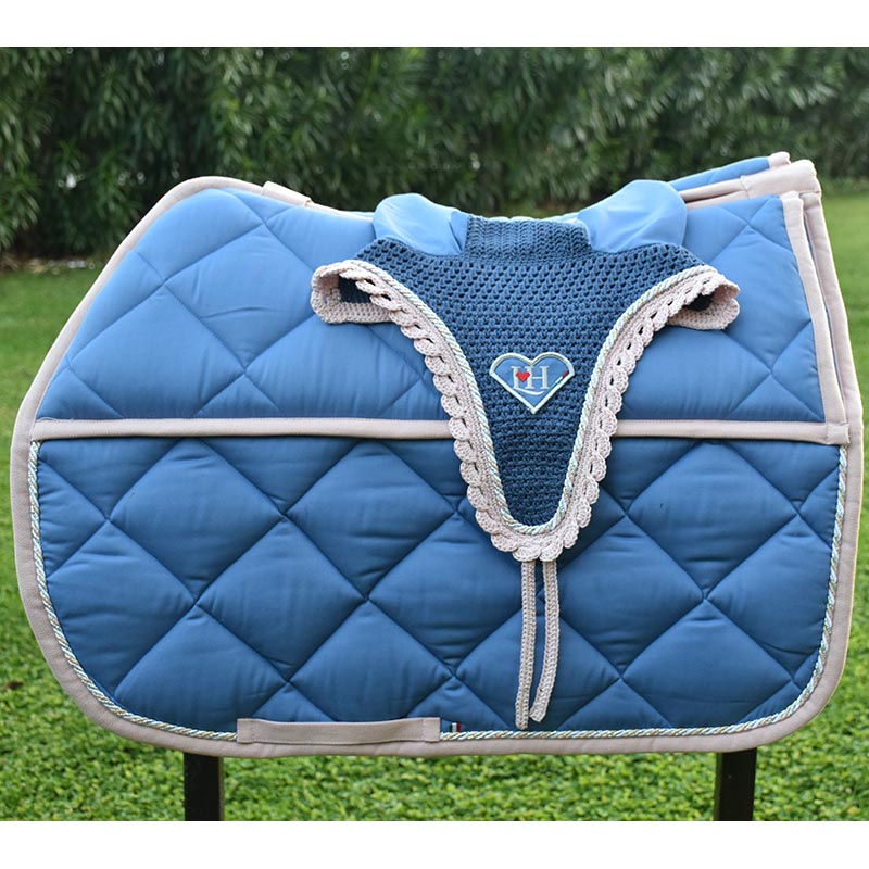 Lovehorses saddlecloth model ANTI SORES. This saddlecloth is designed and tested to prevent and treat saddle sores. has been specifically designed for horses with withers particularly pronounced, as prevention and solution. Allows you to mount the horse even in the presence of saddle sores, avoiding contact with the withers area. To be used without cushions or additional shims under the saddle. This saddlecloth is divided into two parts, the upper part is padded with removable and adjustable shims, which replace the normal pad. While the lower part is no particular padding. The ecological and technical in Terrytex is exclusive, highly breathable, wicks sweat away from the horse and conveys it to the outside. The entire line of saddlecloth LOVE HORSES is lined with 100% cotton fabrics. Due to the precious care of the manufacturer, this new line is perfectly shaped in reference to the needs of the horse and rider, are designed in such a way as to prevent slippage towards the rear of the horse. They are machine washable at 30 degrees, but with centrifugal excluded, or at least very light. Please remove inner pad before washing. On request it is possible to request the cap coordinated ear net.