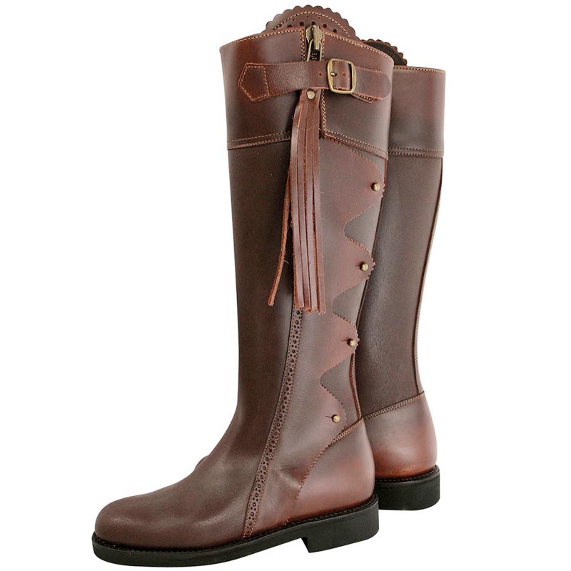 Original Spanish boots, leather, handmade. Made in Spain, completely handwork. The sole is non-slip rubber of excellent quality, with Goodyear stitching. Zip on side along the calf, covered by the band worked, which is fixed to the brass pins. Brown color.