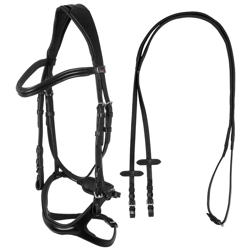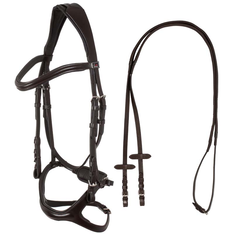 Supreme English bridle in leather with a curved noseband and padded halter, complete with reins. This Supreme English bridle is made of genuine leather, soft and durable, offering maximum comfort for the horse. The anatomic shape of the padded curved noseband enhances the bridle's fit and stability, while reducing pressure on the horse’s nose. Stainless steel buckles allow for easy adjustment. The Supreme bridle comes with reins included.