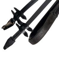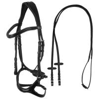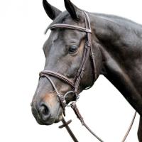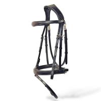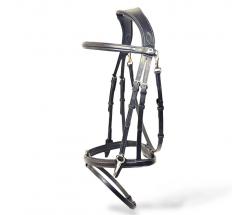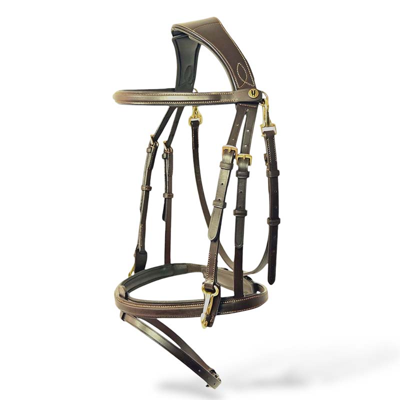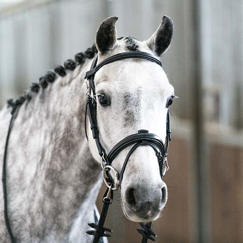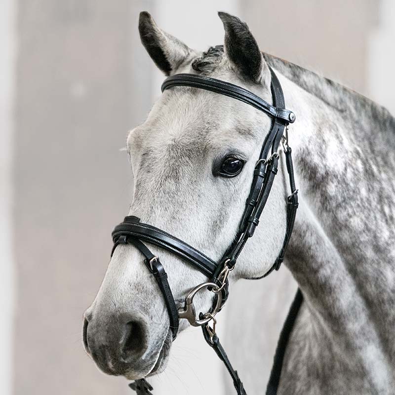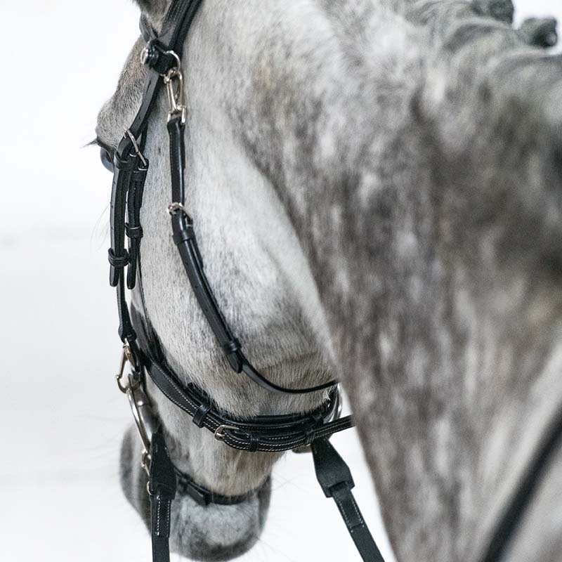English bridle Horsena model in leather and calfskin, with ergonomic padding and anatomical design, featuring a removable flash noseband. Made in Italy. The Horsena Work bridle is crafted from high-quality leather and genuine calfskin, with stainless steel buckles and contrasting stitching. Its anatomical design, made in Italy, is developed to ensure maximum comfort for the horse. Neoprene padding is applied over the buckles, chin strap, and lateral sections of the crownpiece to protect the skin from rubbing and pressure points. The cheekpieces are placed away from the horse’s cheekbone, eliminating the risk of abrasions in delicate areas of the face. • Padded leather noseband with neoprene chin strap, protecting from buckle contact and preventing abrasions. • Anatomical design and optimal fit, with a contoured crownpiece that reduces pressure and cheekpieces positioned away from the cheekbones. • Stable and easy-to-replace browband with buttons. • Neoprene padding to prevent injuries and skin irritation. Reins not included.