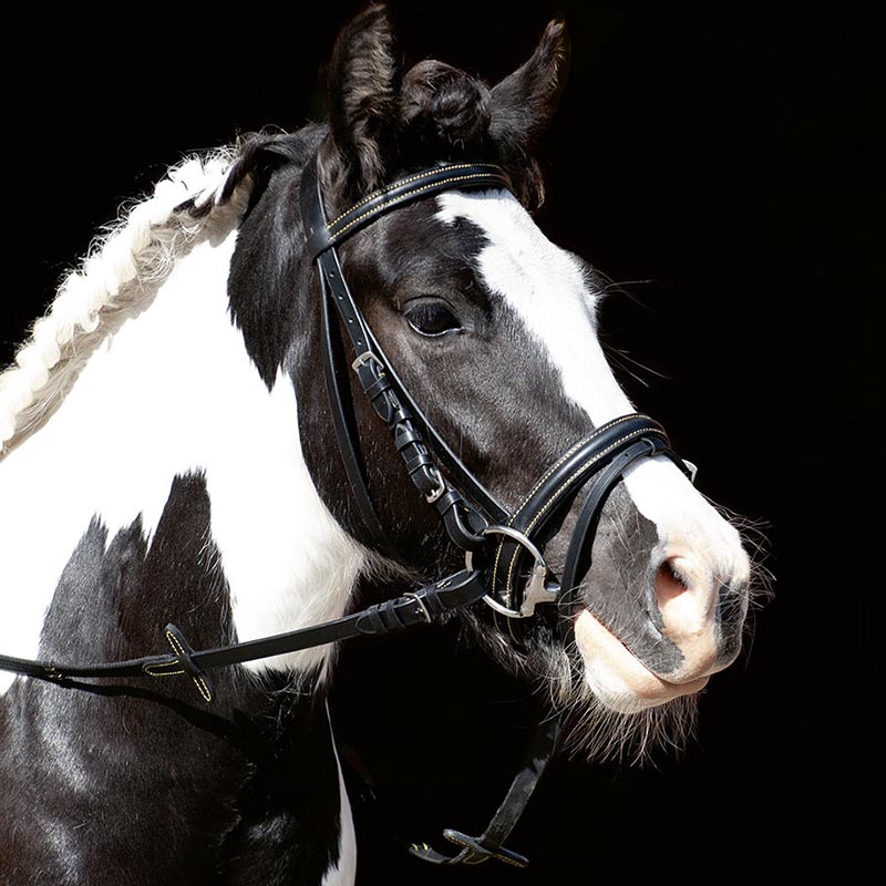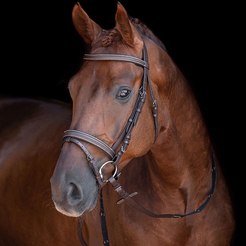 English bridle in bovine leather, with decorative stitching, complete with reins in canvas fabric, with silvered buckles. Provided without bite.