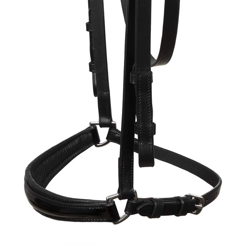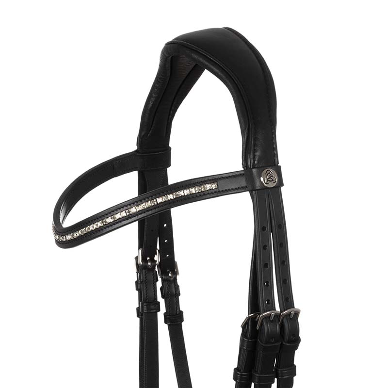 Acavallo Dama bridle in genuine Italian leather with a crystal-embellished browband and stainless steel buckles. The Acavallo Dama bridle is crafted from high-quality calfskin leather, providing exceptional comfort and a perfect fit. The browband is adorned with precious crystals, creating a refined sparkle, ideal for high-level competitions. The padded noseband features an elegant glossy finish. Made from Italian calfskin leather, this bridle offers durability and resilience, while the stainless steel buckles allow for easy adjustments. The anatomical, shaped headpiece reduces pressure on the horse’s head, ensuring maximum comfort.