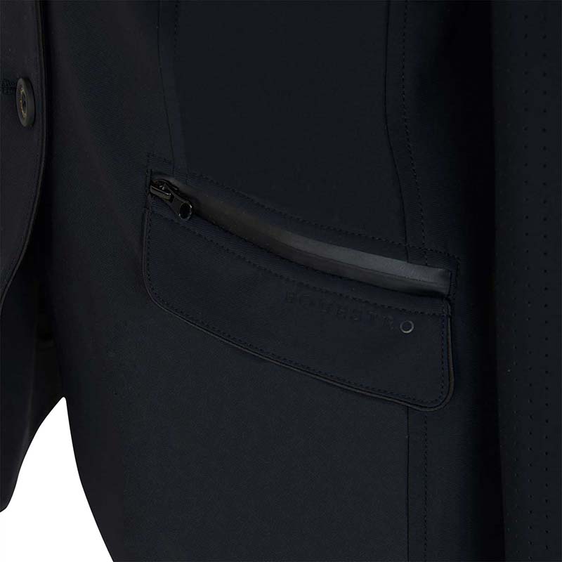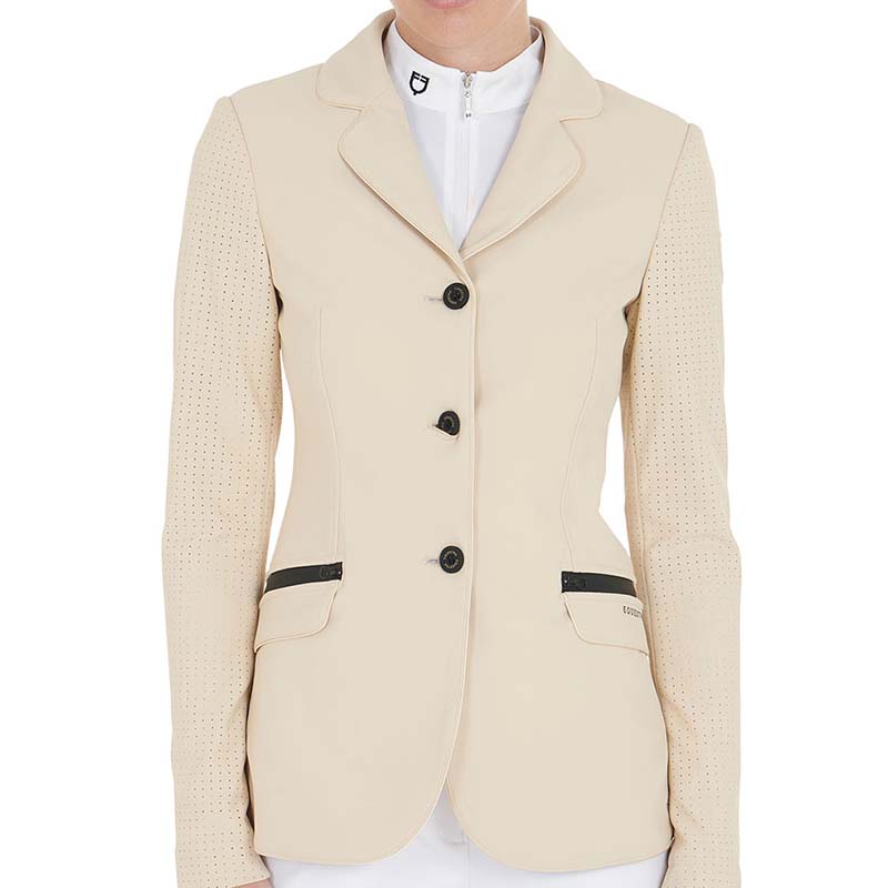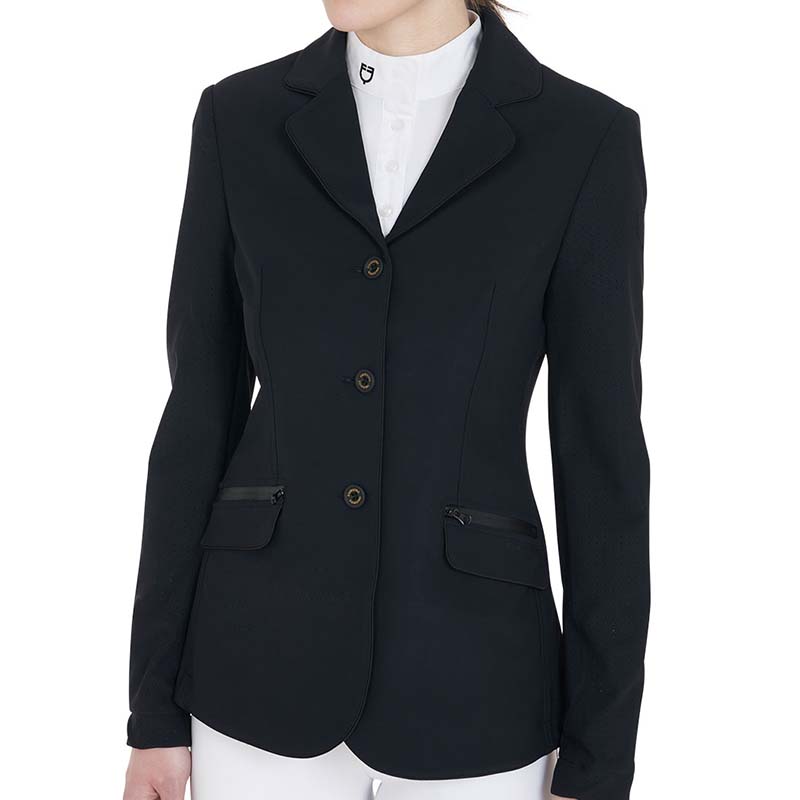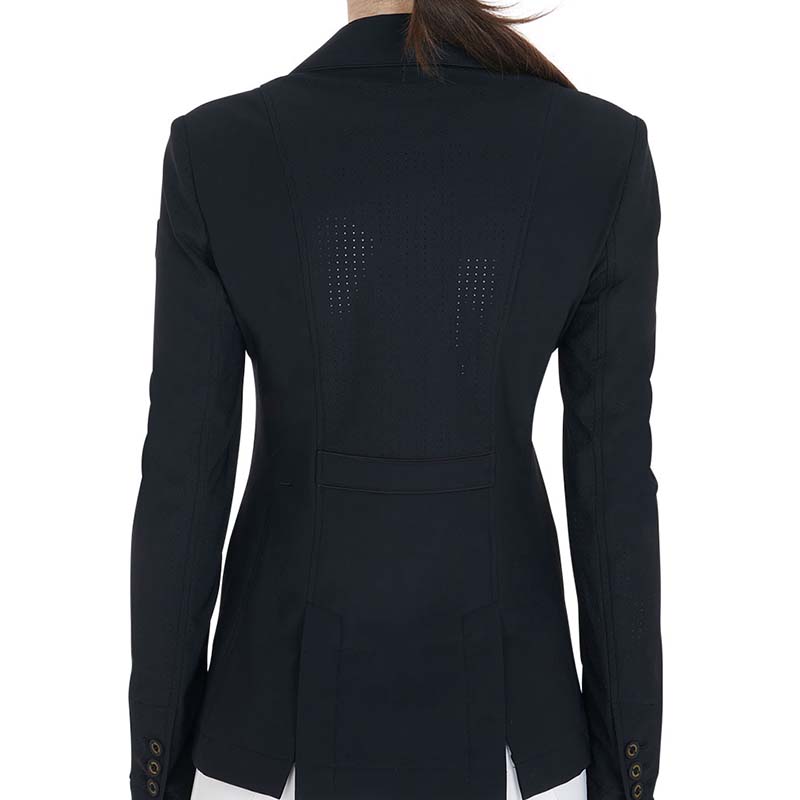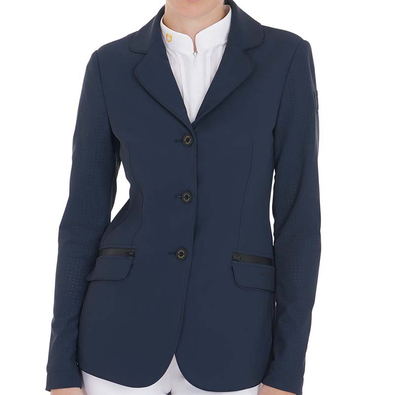 Ladies Equestro Mesh competition jacket. Showjumping jacket for women, with back and sleeves in perforated mesh effect fabric. Front closure with buttons, zipped pockets with false flaps. Stretch and breathable technical fabric, without internal lining, ideal for the warmer seasons, regular fit with fitted side.