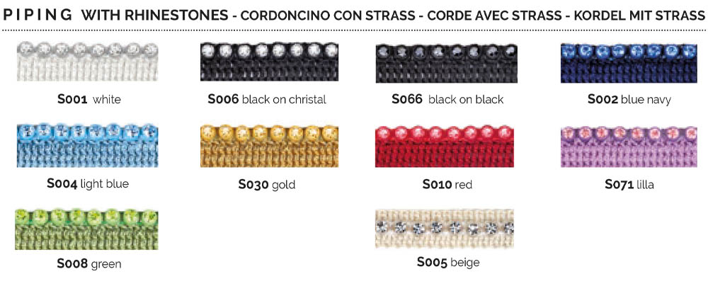 To choose the color of the Strass trimming, see the “technical data form”. Once completed the purchase, simply specify in the notes of the cart the color chosen.