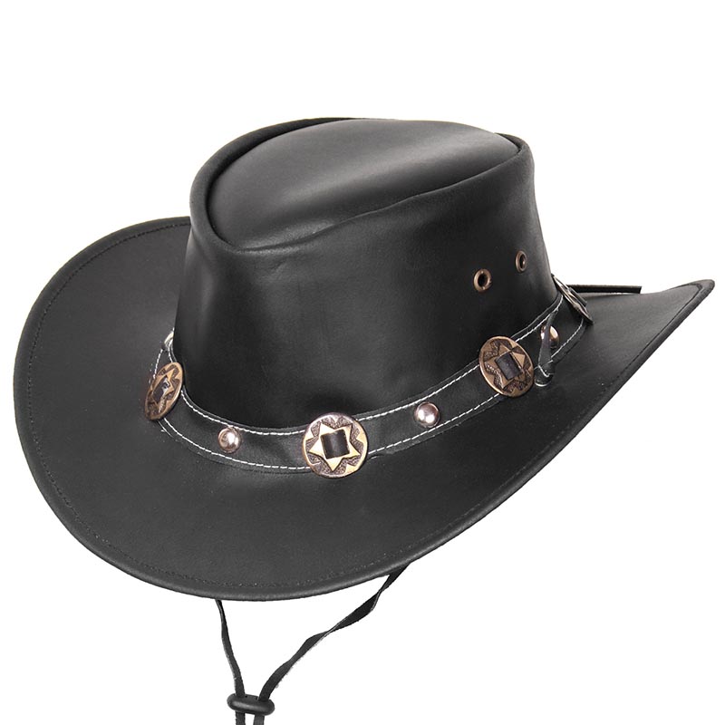 Australian hat in leather model Concho, unisex and waterproof. The leather is very beautiful and strong, and water-repellent. It is possible to shape the edges due to a thin metal wire inside.