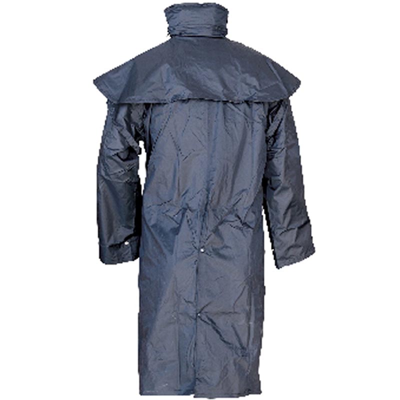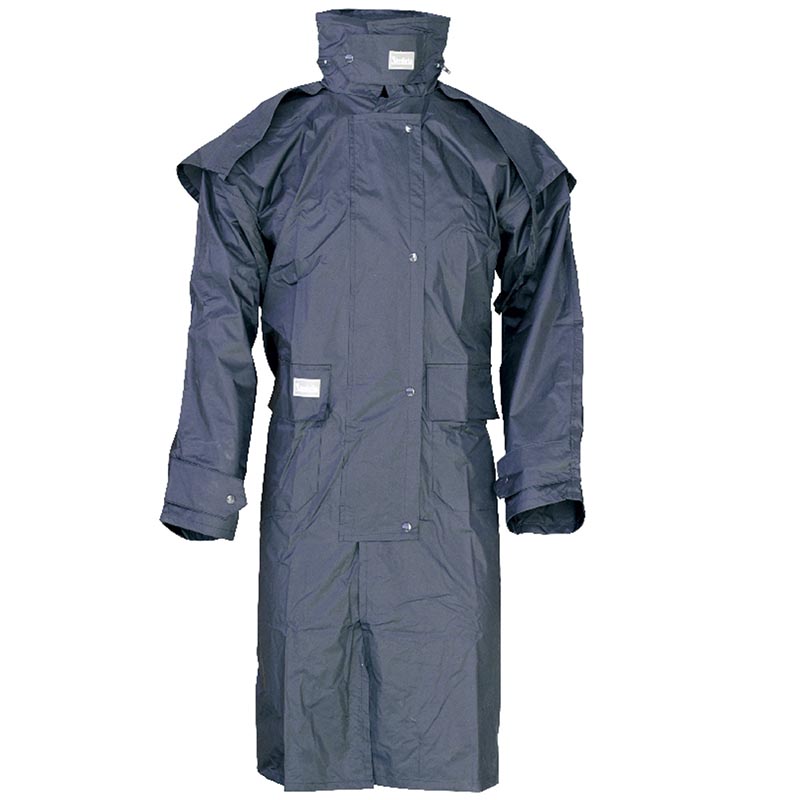 Tear resistant waterproof jacket. Side openings to cover the saddle, a removable hoodie. Water column: 6000 mm. Color Blue.