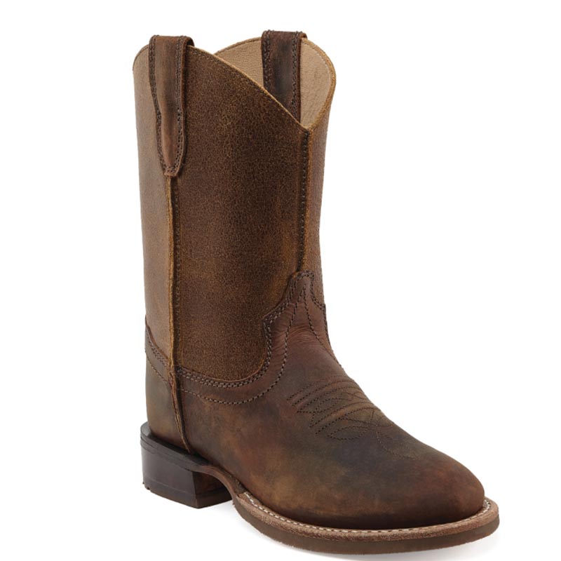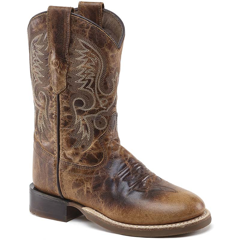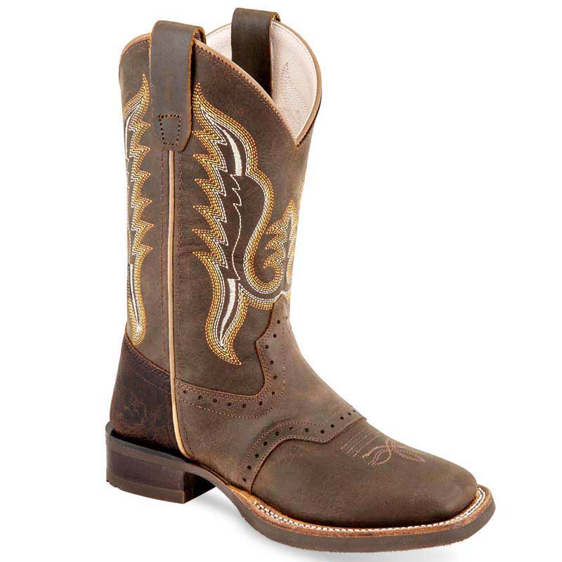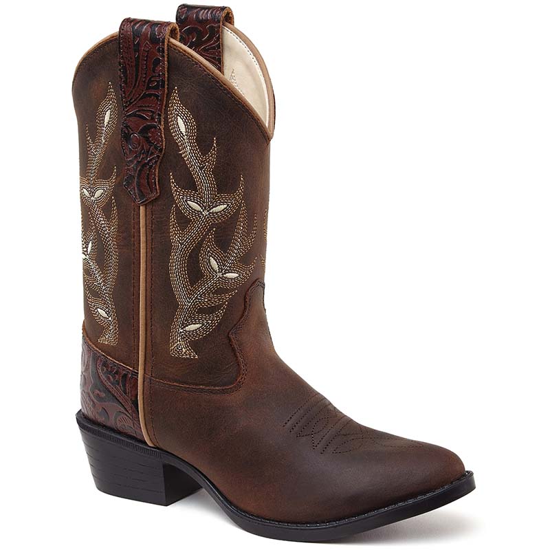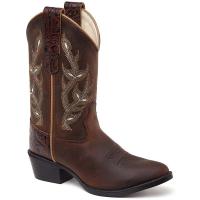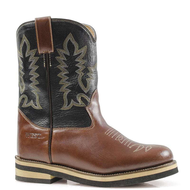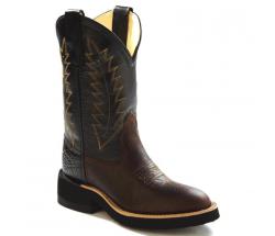 Old West Cowboy Boots, 1606Y model in synthetic leather. Rubber sole with Good-year stitching. 3-Row fancy stitch, Hand corded medallion, Round toe, Crepe out sole.