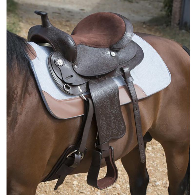 Randol's Topeka western saddle with wide gullet. American riding saddle, with withers wide, suitable for horses with withers particularly round like Haflinger, Gypsy Vanner, TPR and similar breeds, with round and short back. Fiberglass saddlebow, with round skirts and decorative flower buffalo leather. Brown color, seat 16", opening wide withers. Wood stirrups covered in leather, seat in suede.