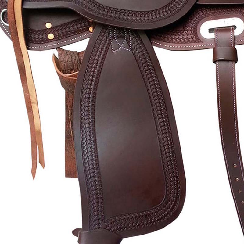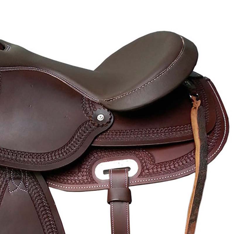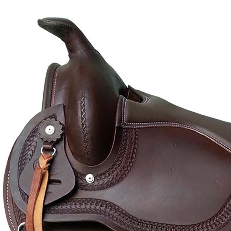 Western trail saddle Natowa, model 143. American saddle leather, dark oil colored, with double tooling border stamp, and seat in smooth leather. It is supplied with the straps for the front girth, and second rear girth complete. The stirrups are in metal with platform covered in leather. The lower part is coated in wool, the back of the cantle and the bottom of gullet are coated in suede. Double round skirts. Seat 16”. Supplied with latigo laces.